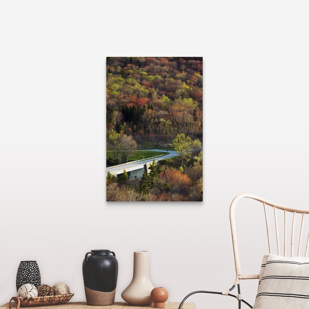 "High angle view of Blue Ridge Parkway winding through trees, spring, North Carolina" Canvas Wall Art