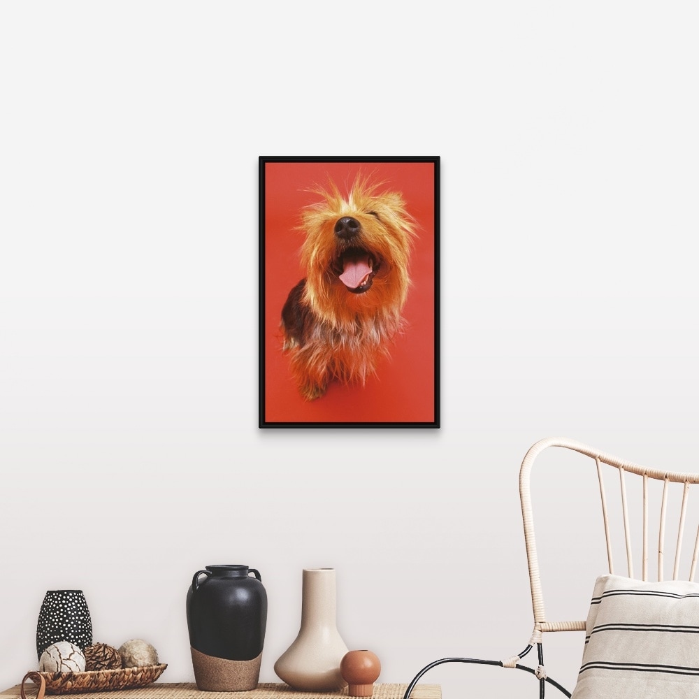 "high angle view of a Yorkshire terrier sitting with its mouth open and lookin" Black Float Frame Canvas Art