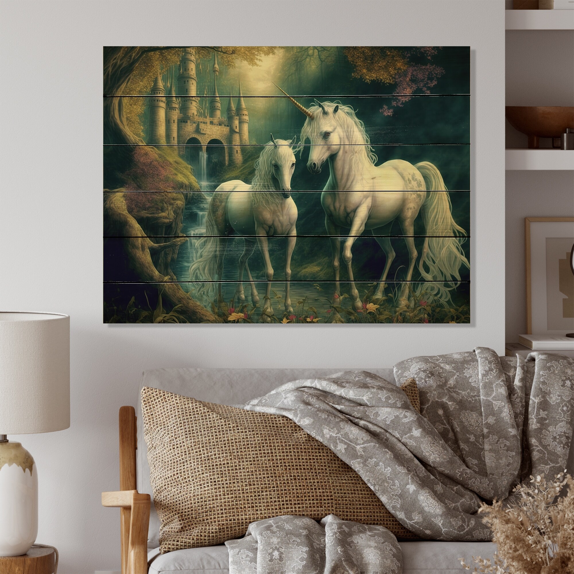Designart 'Two Gracious Unicorn in Fantasy Landscape' Animals Horse Wood Wall Art - Natural Pine Wood