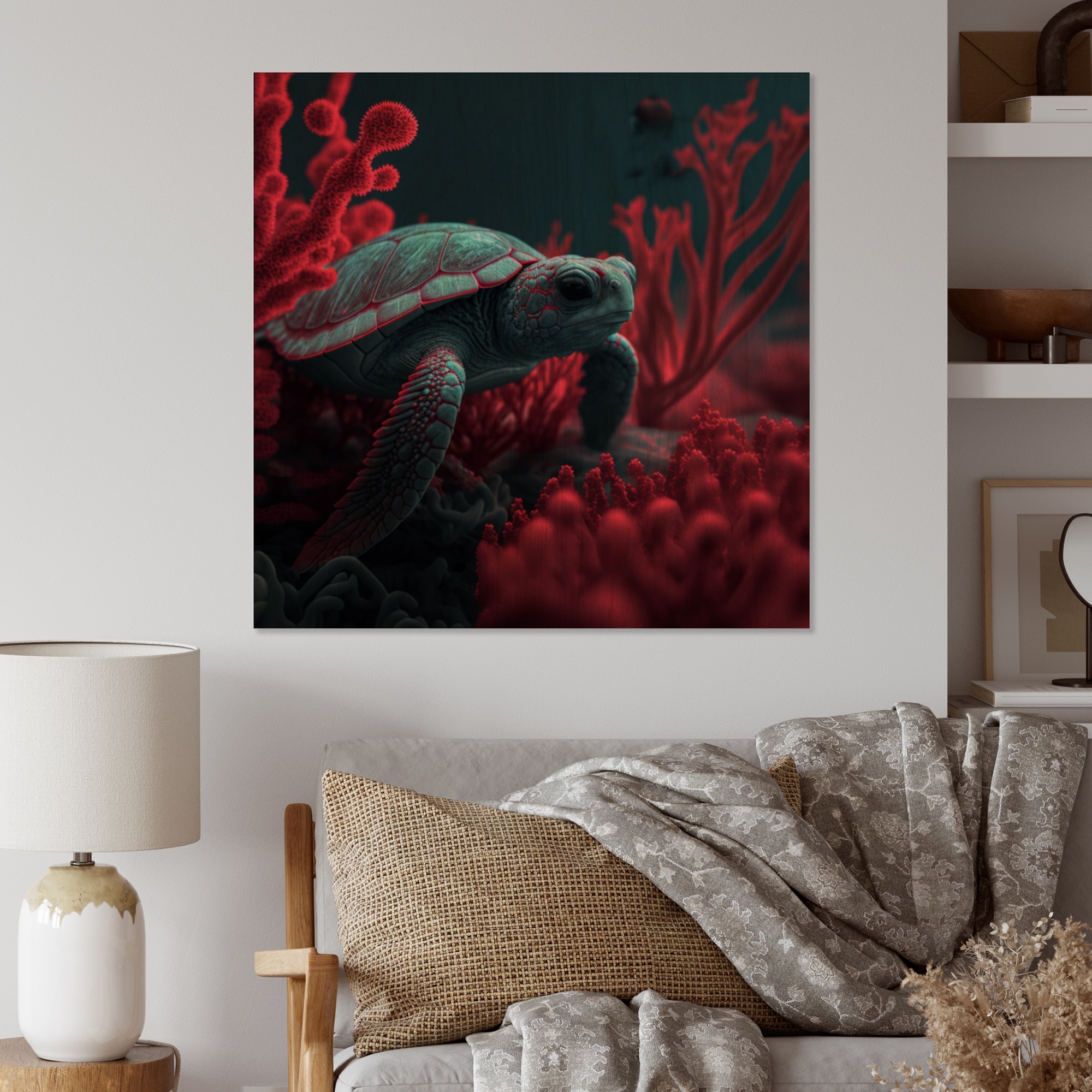 Designart 'Black And Red Deep Sea Turtle III' Animals Turtle Wood Wall Art - Natural Pine Wood