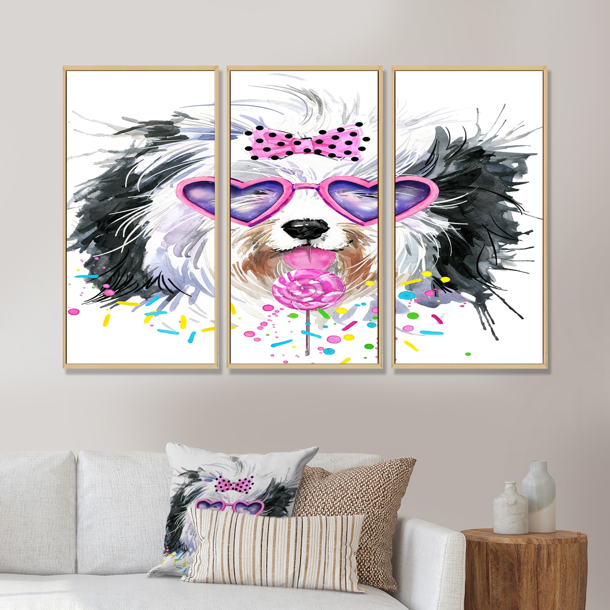 Designart "Lovely Dog with Pink Heart Glasses" Animal Framed Wall Art Set of 3 - 4 Colors of Frames