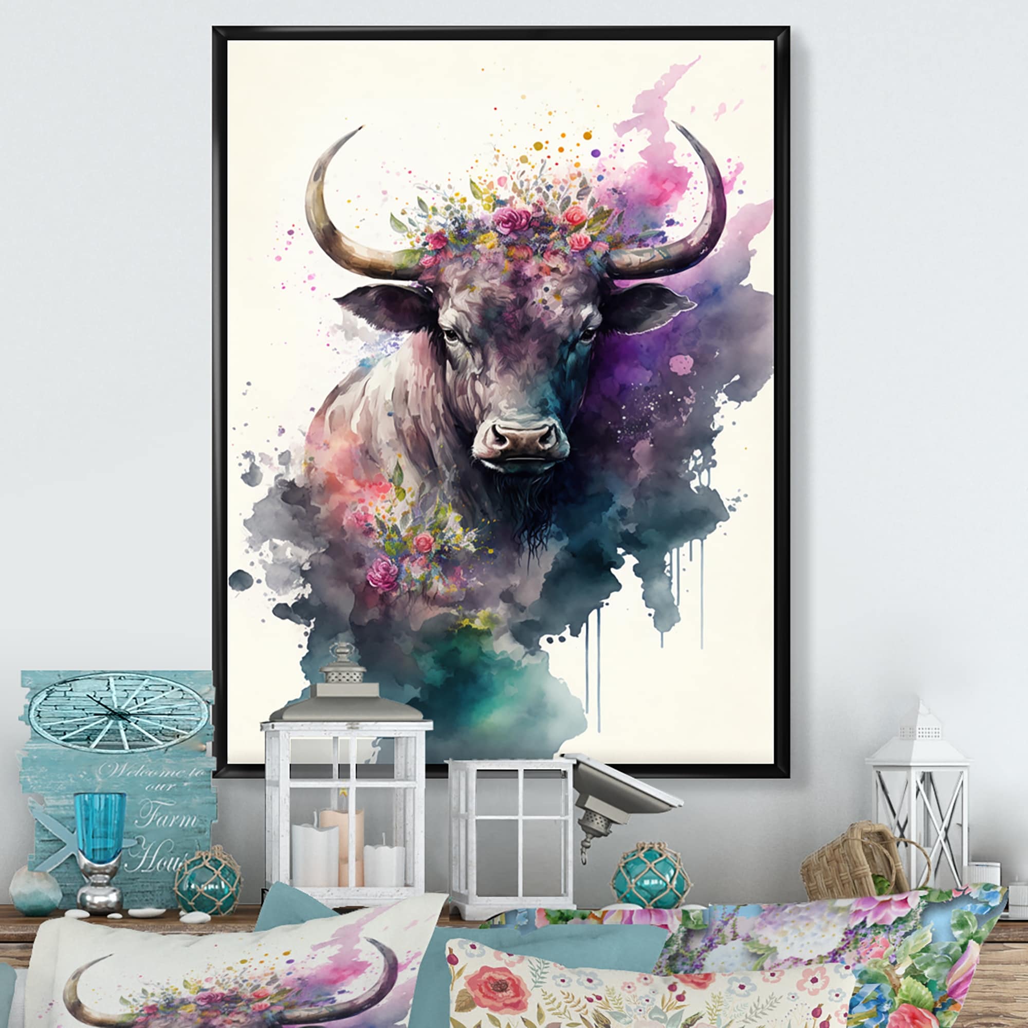Designart "Cute Taurus Floral Art III" Animals Framed Canvas Art Print
