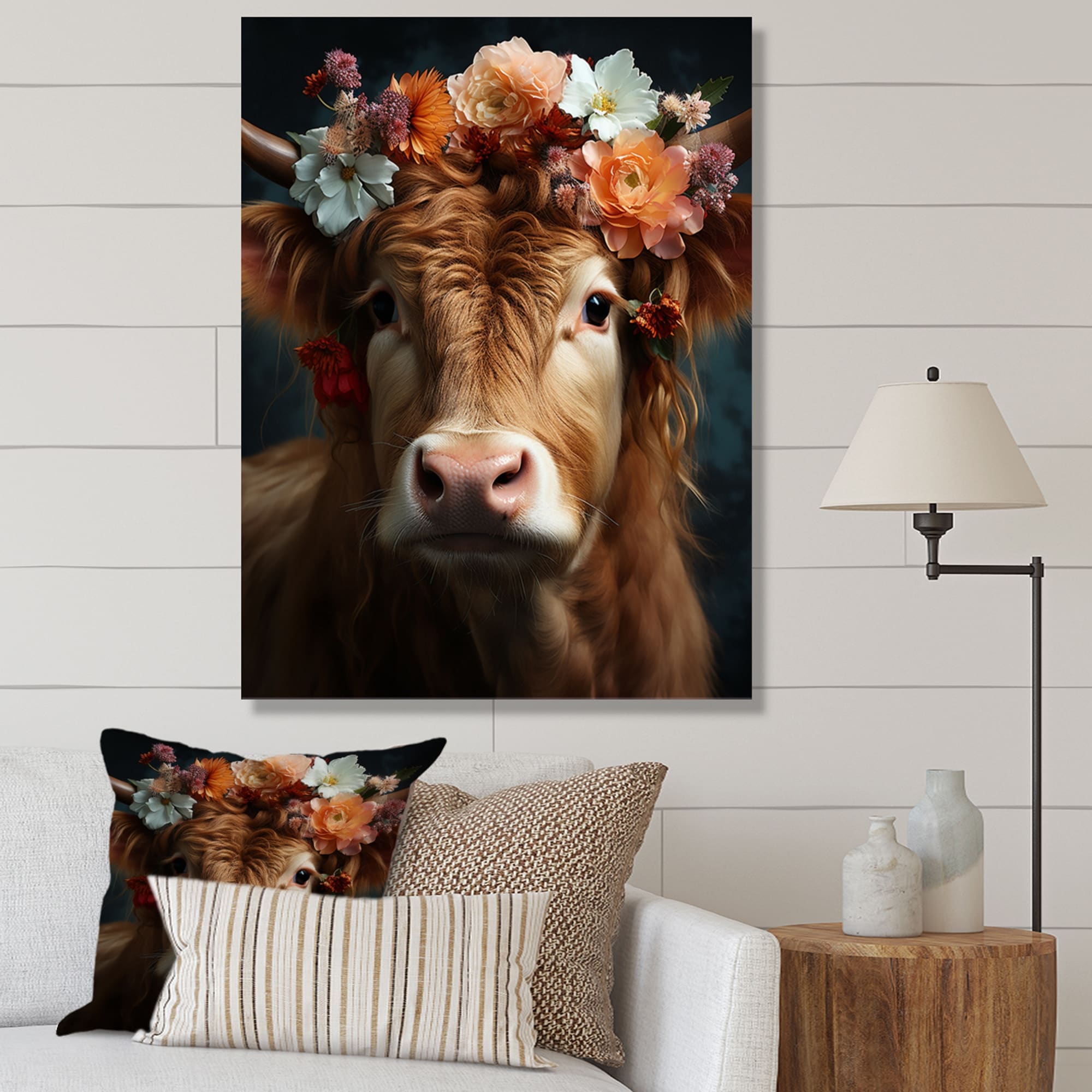 Designart "Cow Flower Crow" Animals Cow Canvas Wall Art