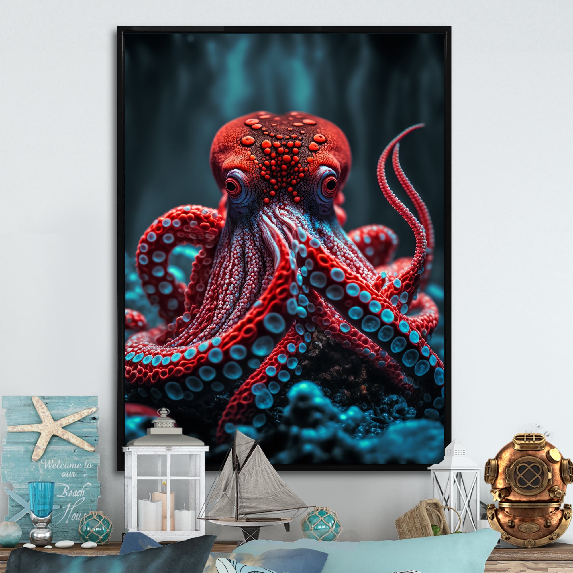 Designart "Red Octopus on the Ocean Floor IV" Animal Octopus Framed Canvas Wall Art Print
