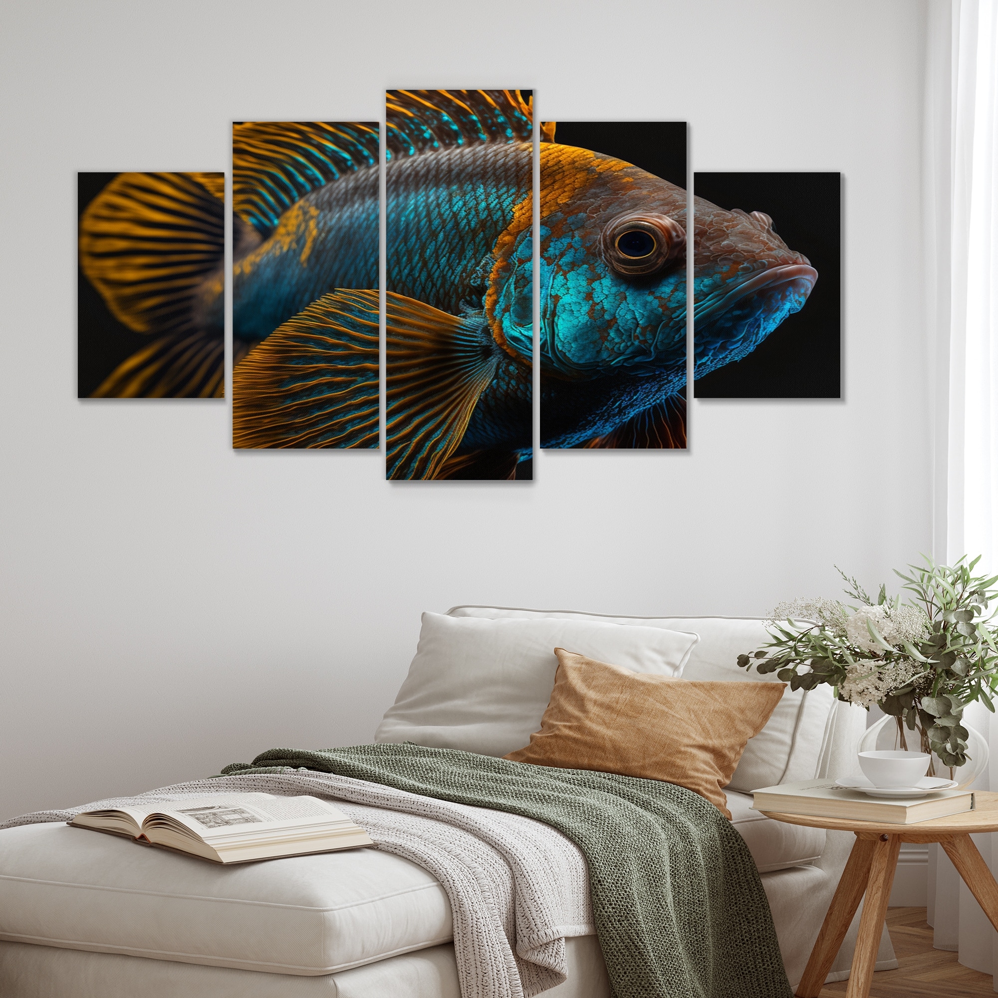Designart "Tropical Blue Fish in Shades of Blue And Orange IV" Animal Fish Multipanel Canvas Wall Art