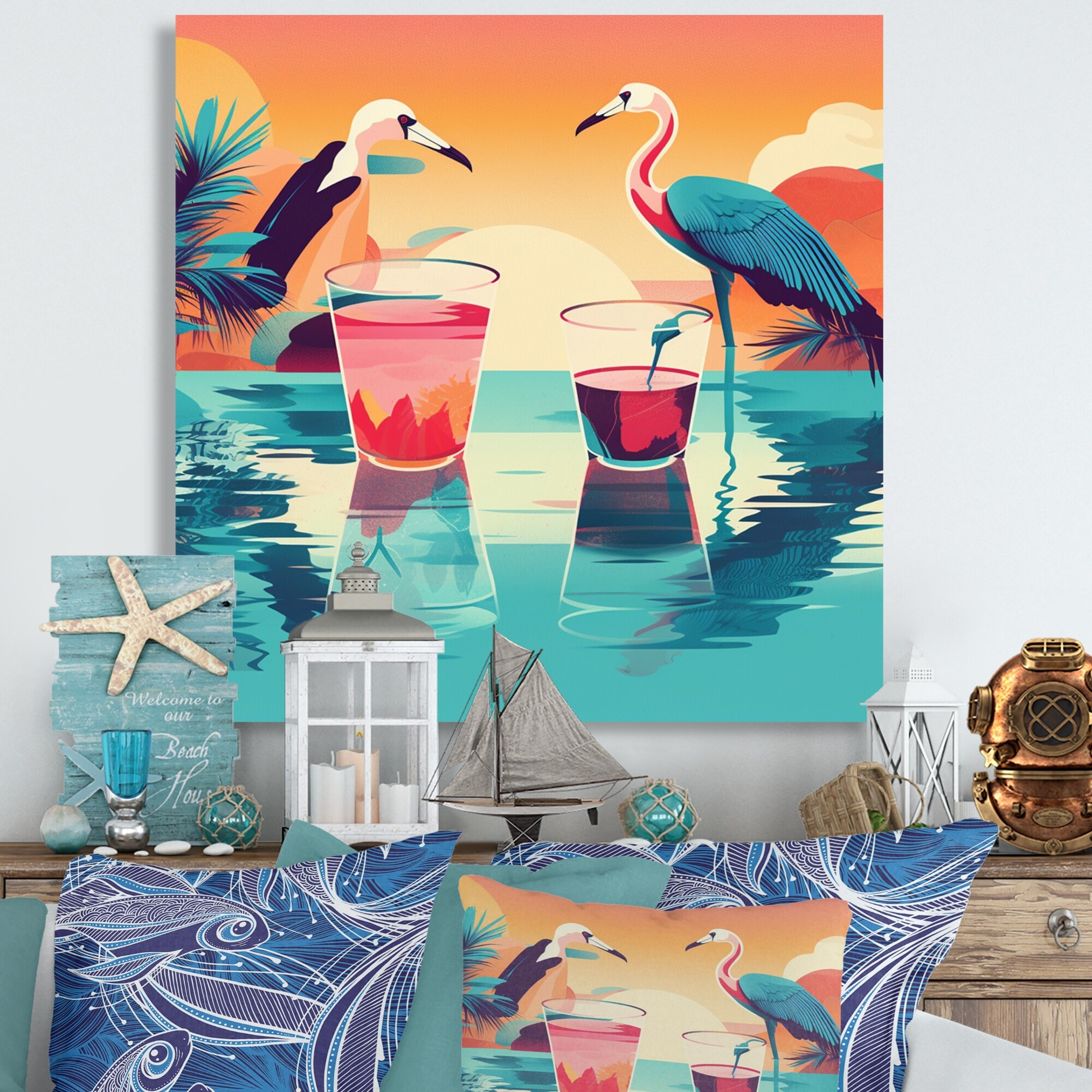 Designart "Blue Pink Flamingos in the Sea At Sunset" Animals Flamingo Metal Wall Art