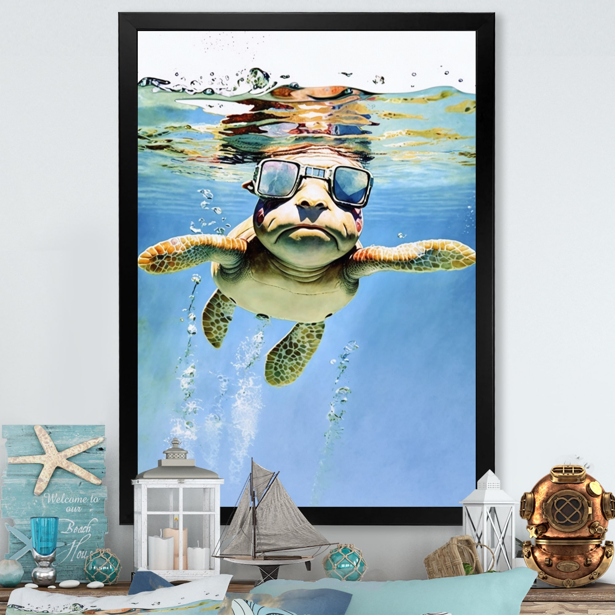 Designart "Turtle With Glasses in the Ocean I" Animals Framed Art Print