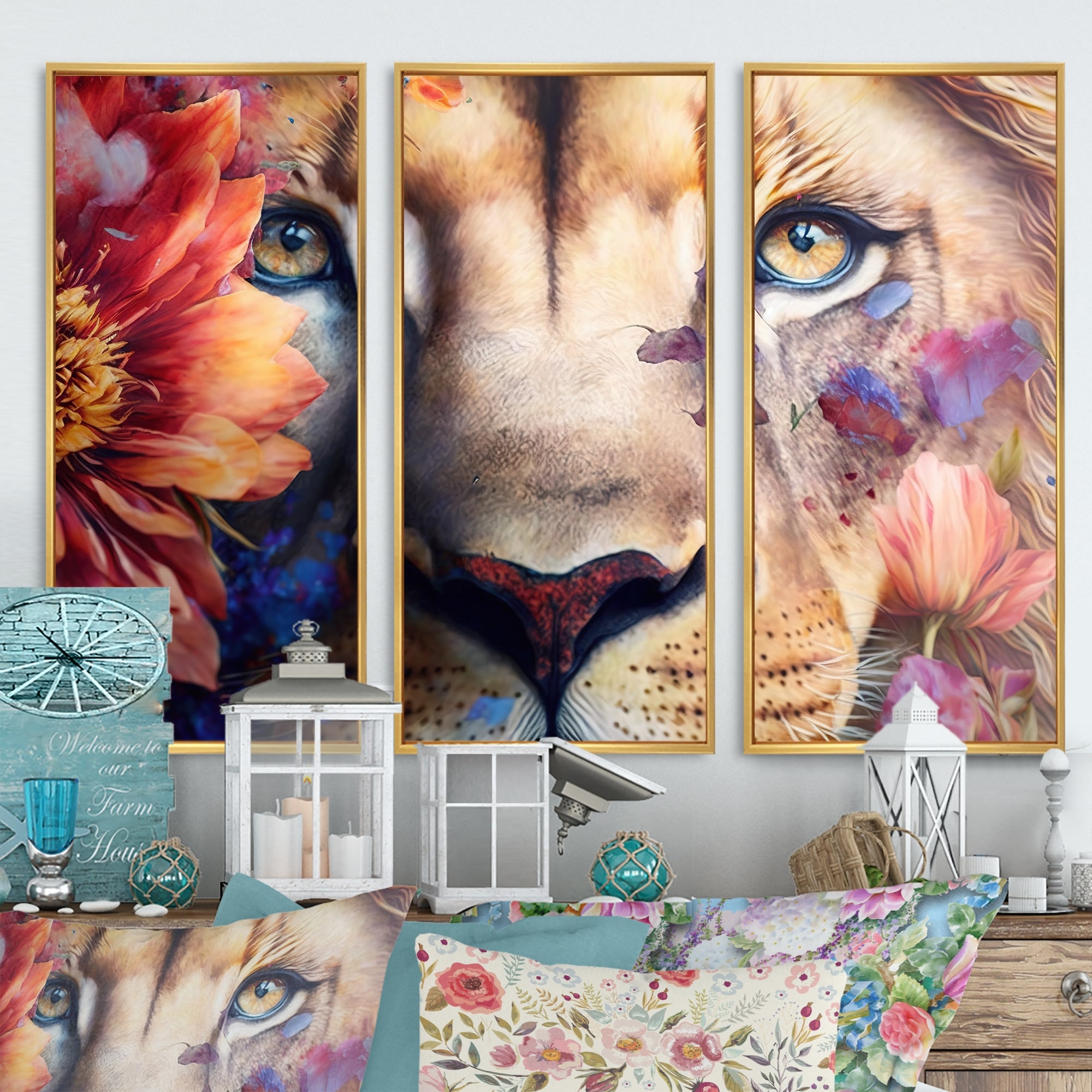 Designart "Lion Portrait With Flowers II" Animals Lion Framed Canvas Art Print - 3 Panels