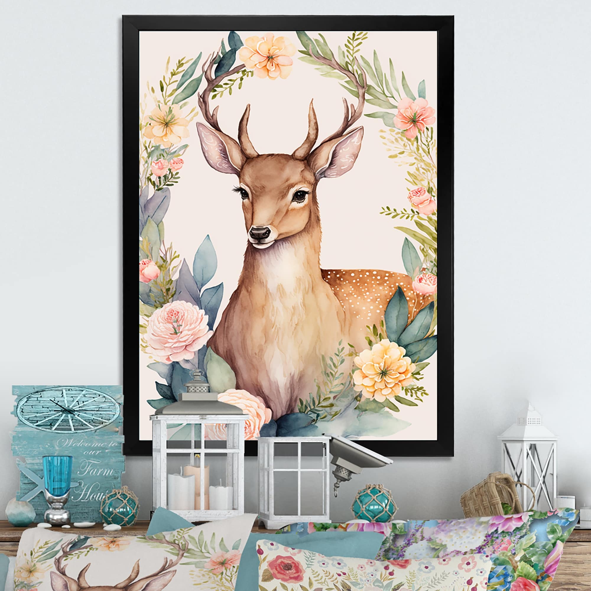 Designart "Cute Little Deer With Pink Flowers" Animal Landscape Framed Art Print