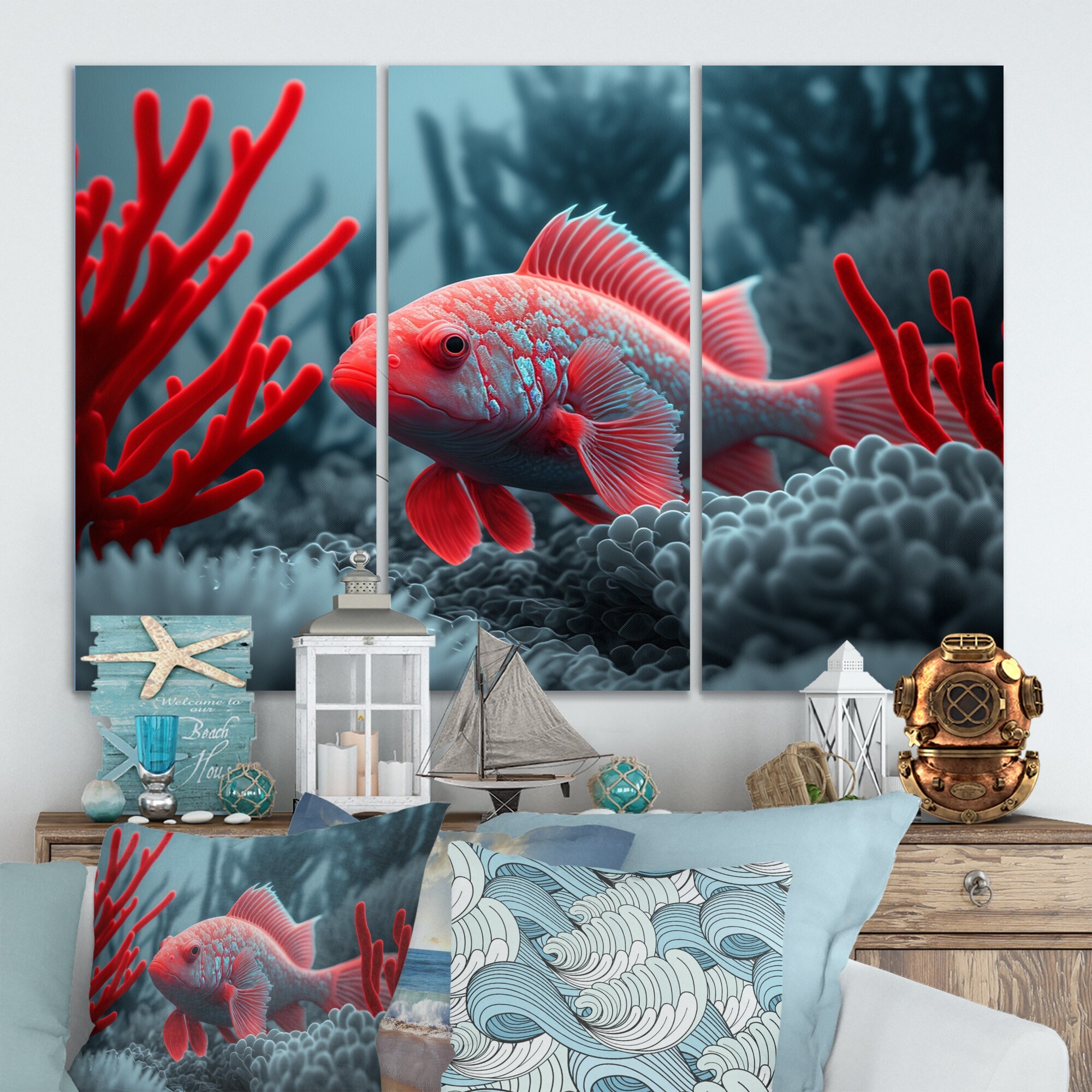 Designart "Tropical Fish in Blue And Red II" Animal Fish Canvas Wall Art Print