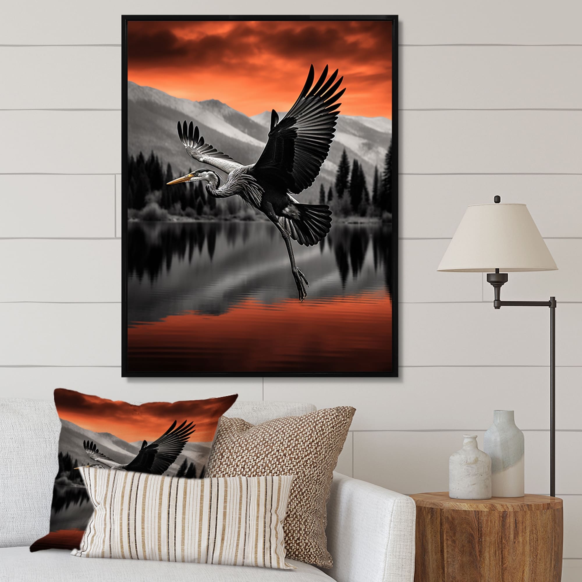 Designart "Orange Grey Heron Graceful Heron in Autumn III" Animals Heron Framed Canvas Art Print
