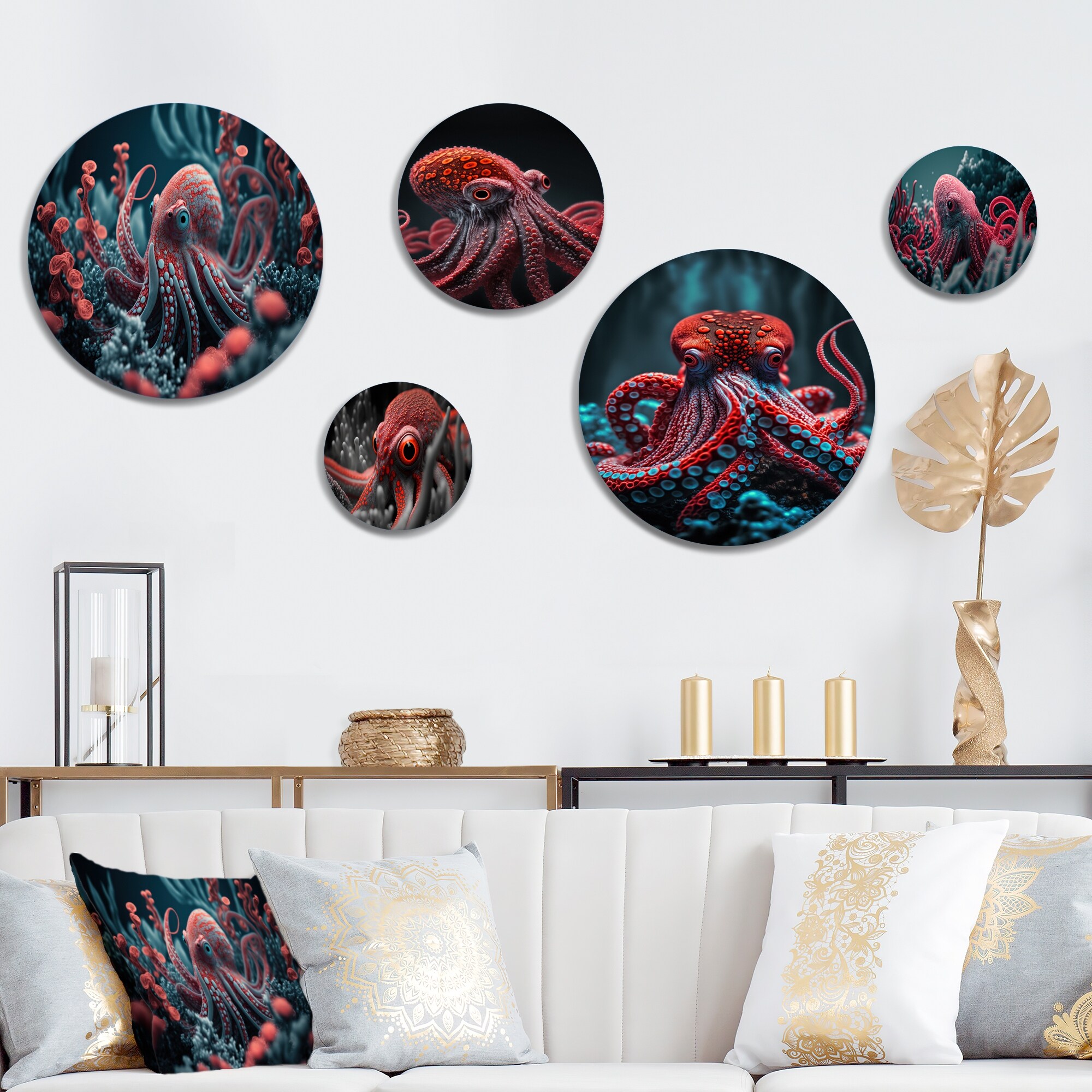 Designart "Red Octopus on the Ocean Floor I" Animal Octopus Metal Round Wall Art Set of 5
