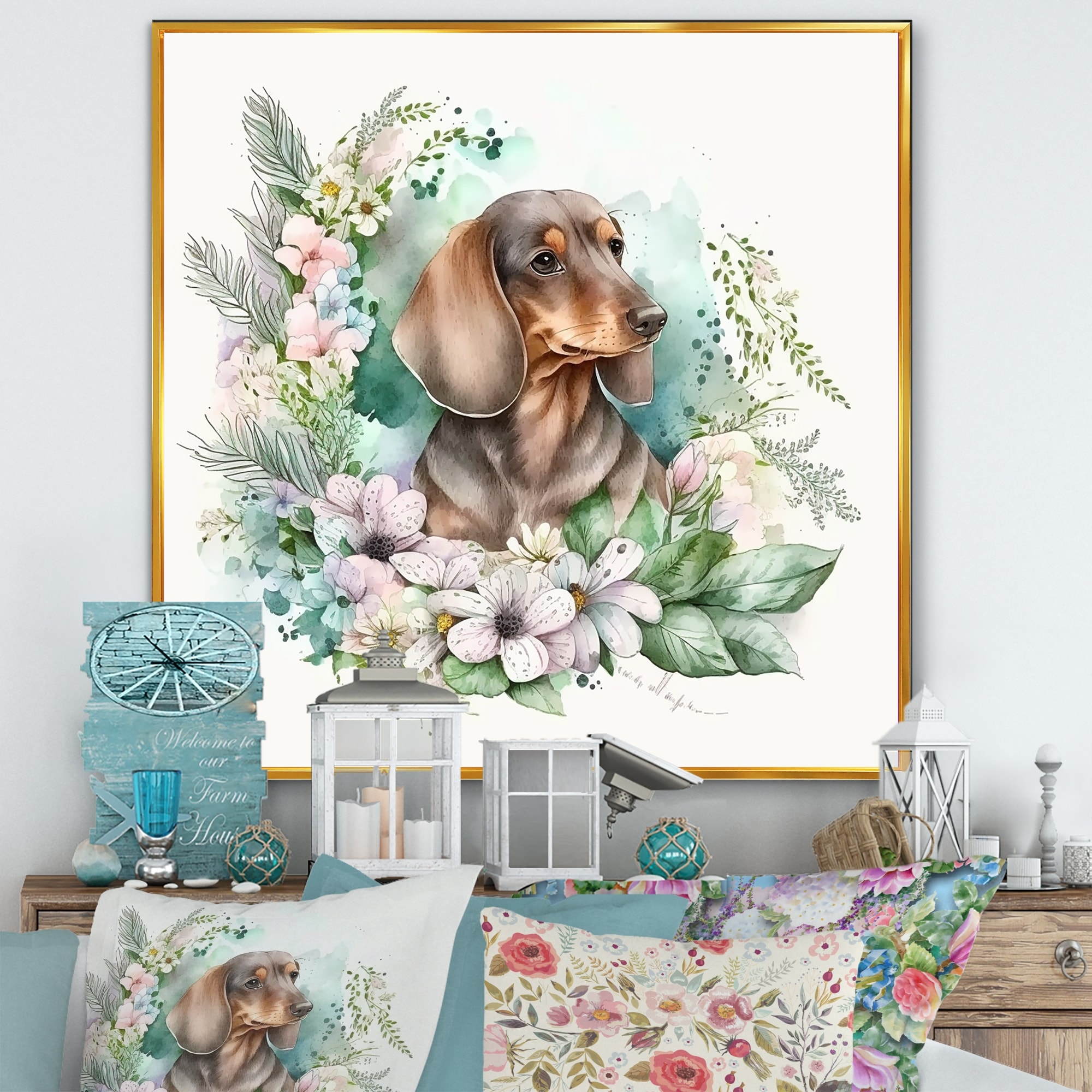 Designart "Cute Watercolor Dachshund With Flowers III" Animals Framed Canvas Wall Art Print