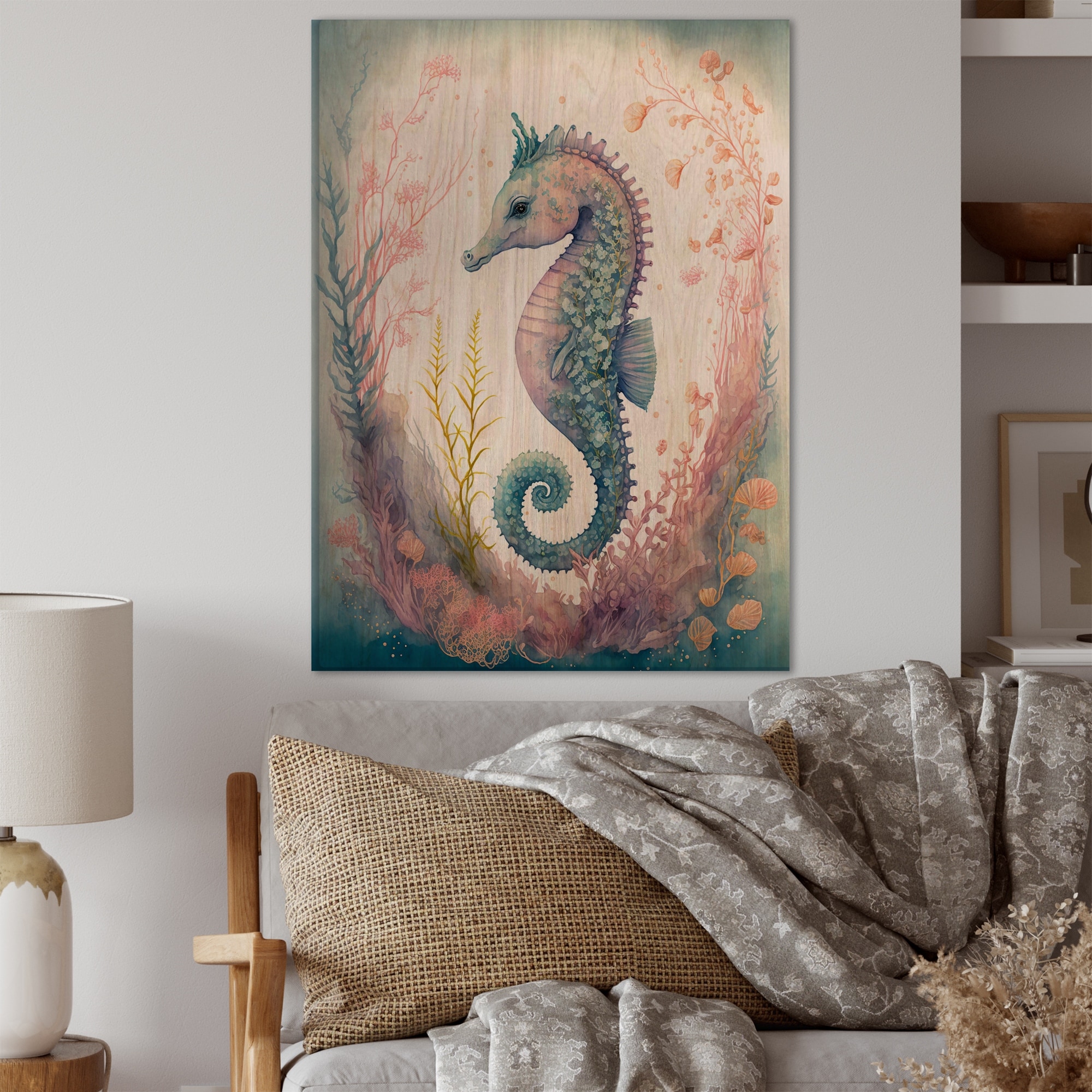 Designart 'Cute Baby Seahorse in the Deep Sea I' Animals Seahorse Wood Wall Art - Natural Pine Wood