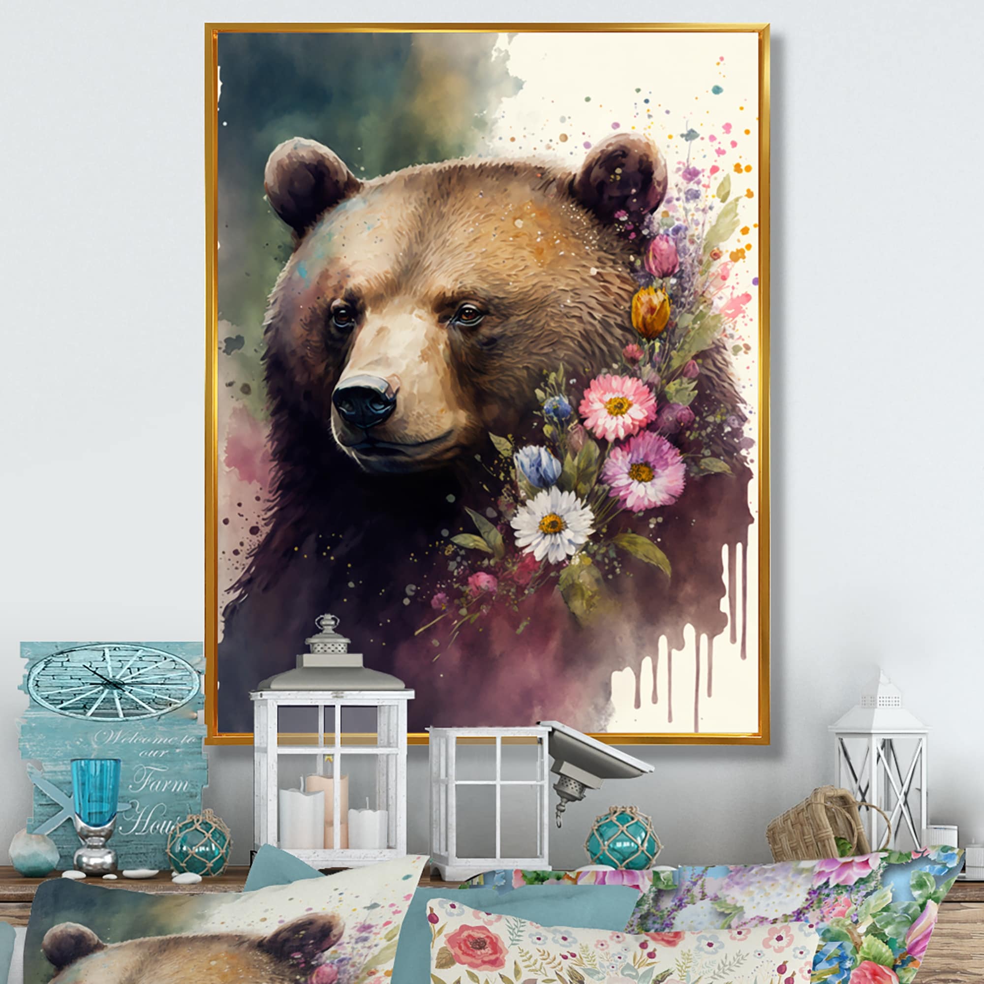 Designart "Cute Bear Floral Art I" Animals Framed Canvas Art Print