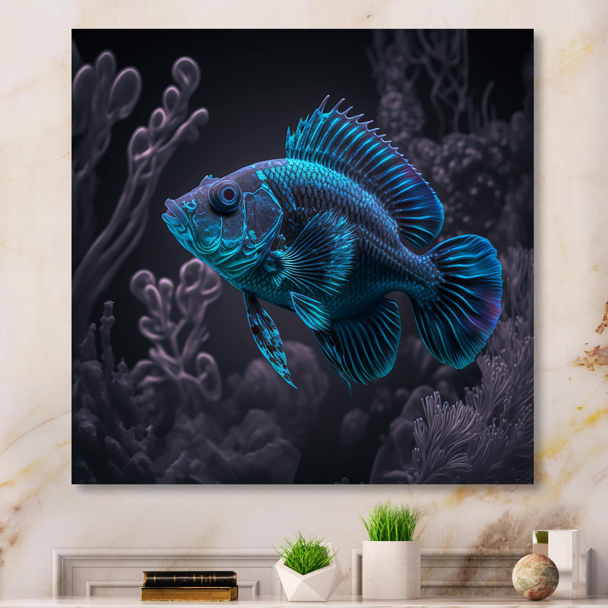 Designart 'Mysterious Tropical Blue Fish in Tones of Blue I' Animal Fish Metal Wall Art