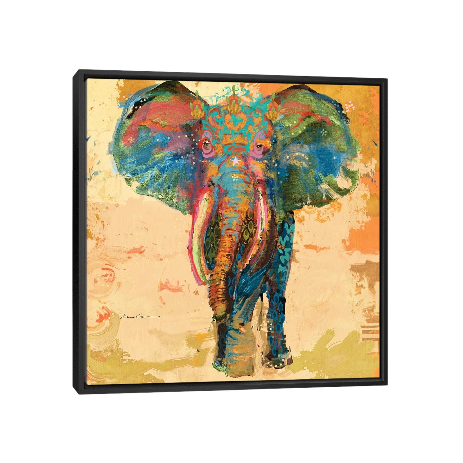 Designart "Retro Elephant Surrounded By Flowers II" Animals Elephant Framed Canvas Wall Art Print