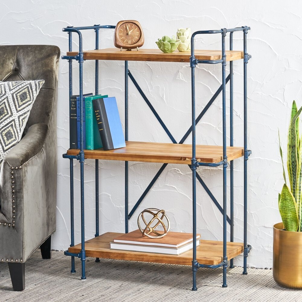 Jamestown Industrial 3 Shelf Firwood Bookcase, Antique Brown, Blue, and Black