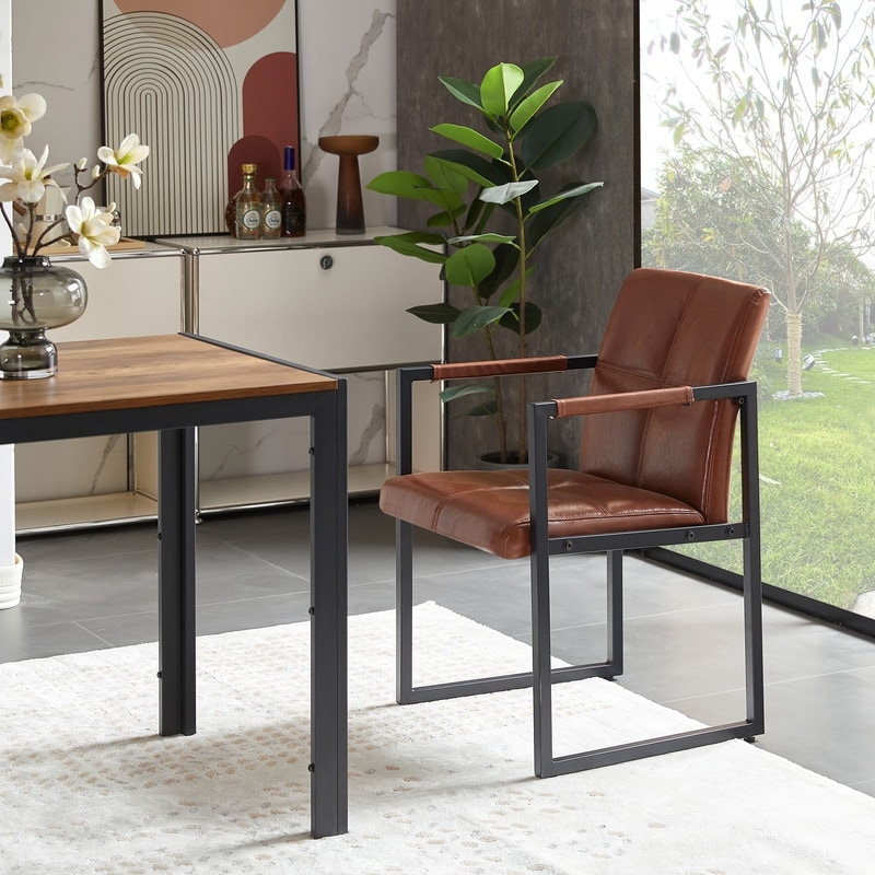 2 Pcs PU Leather Dining Chair, Black Metal Frame Arm Chair