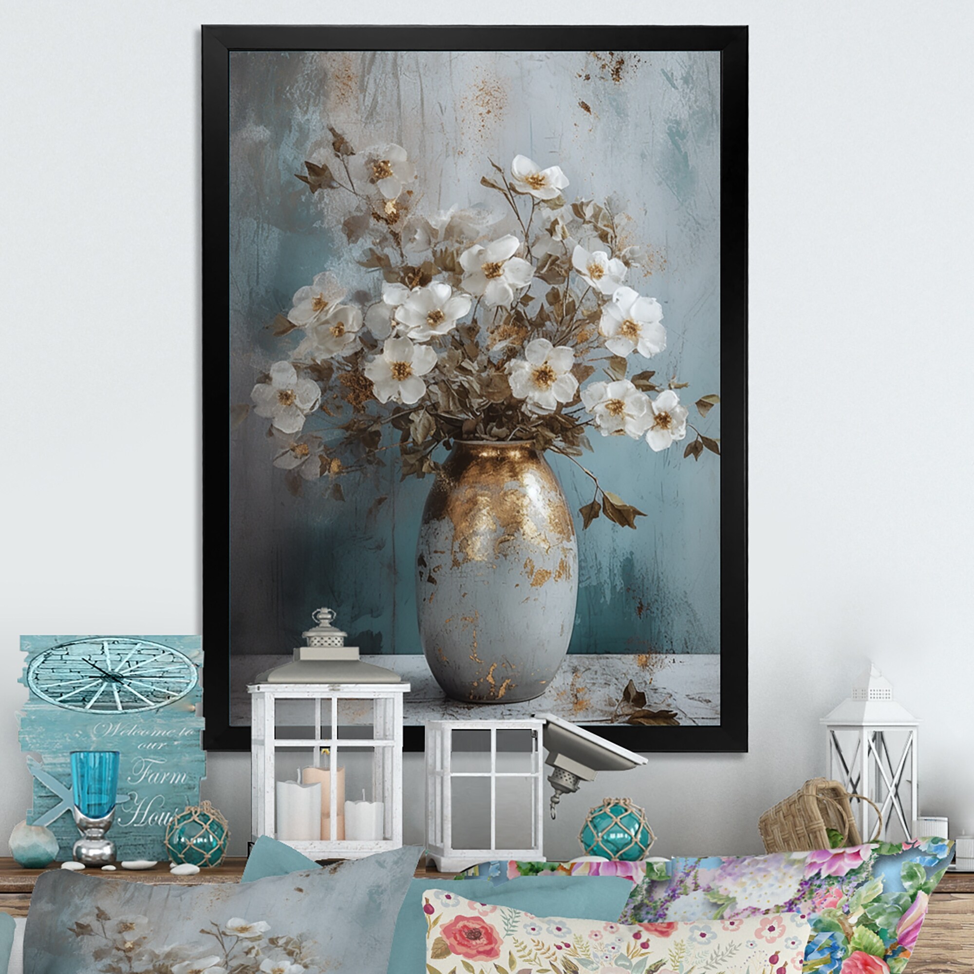 Designart "Golden White Floral Arrangement in Vase Iii" Floral Framed Wall Art Prints