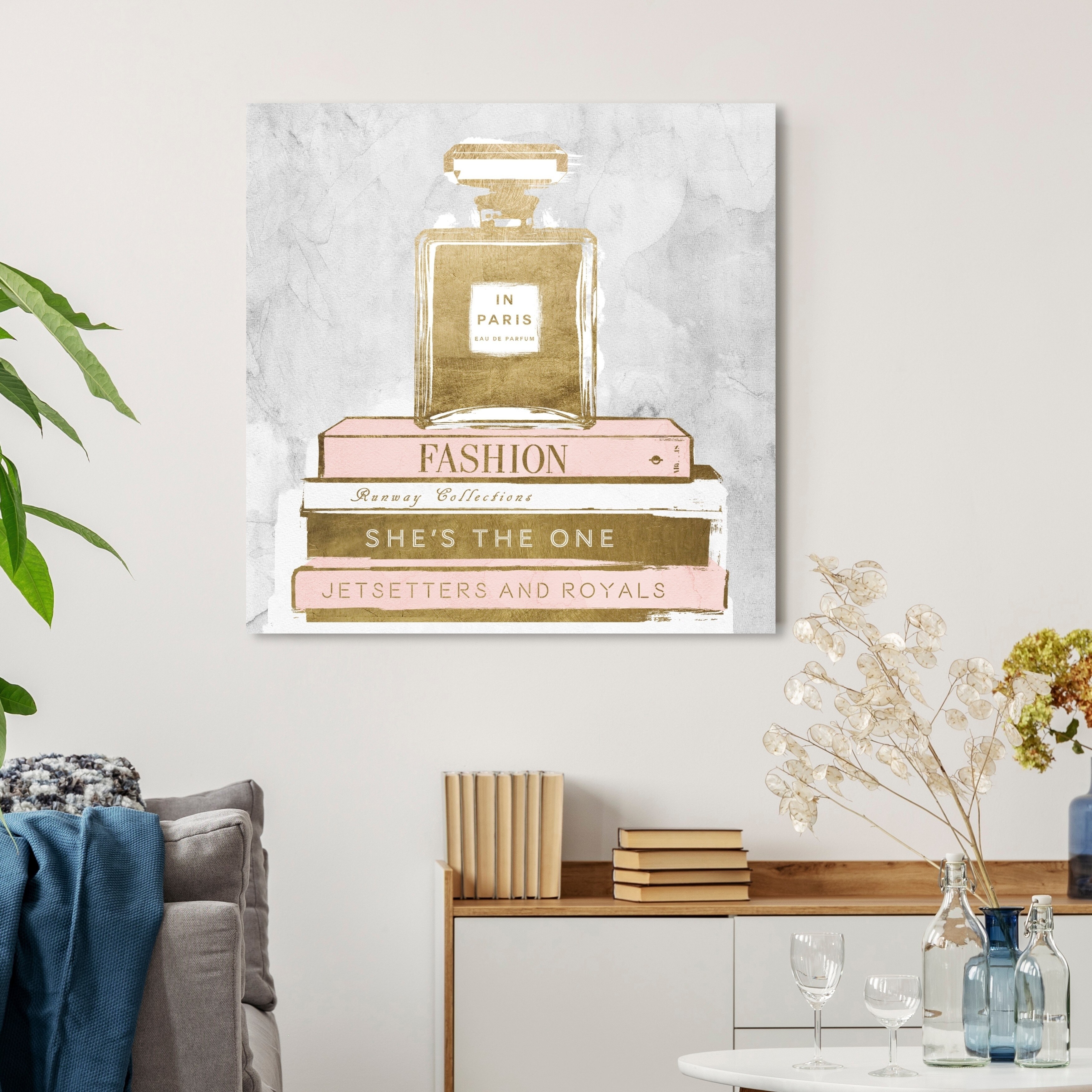 Oliver Gal 'Perfume and Books Gray' Fashion and Glam Wall Art Canvas Print - Gold, Pink
