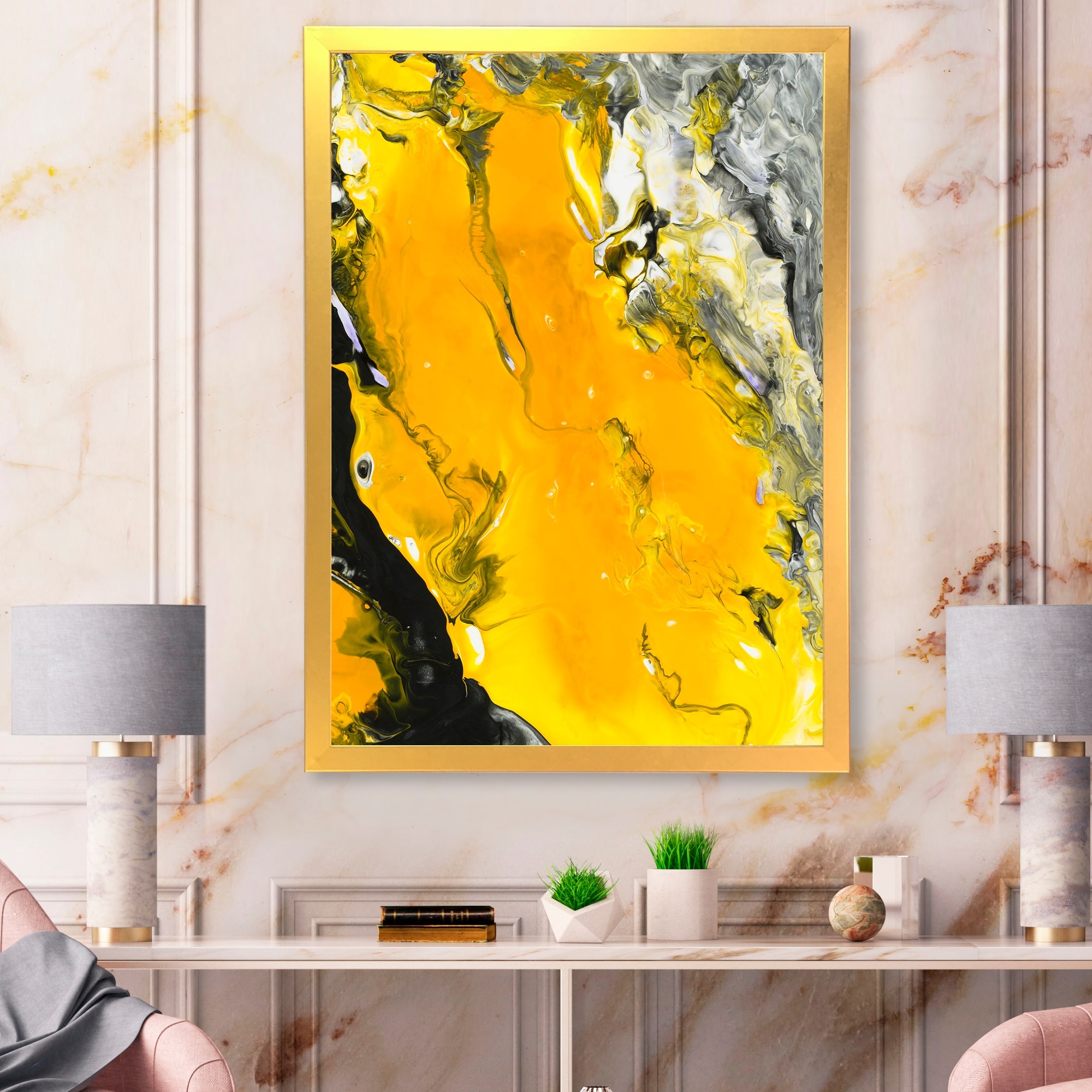 Designart "Yellow Black And White Liquid Art VI" Modern Framed Art Print