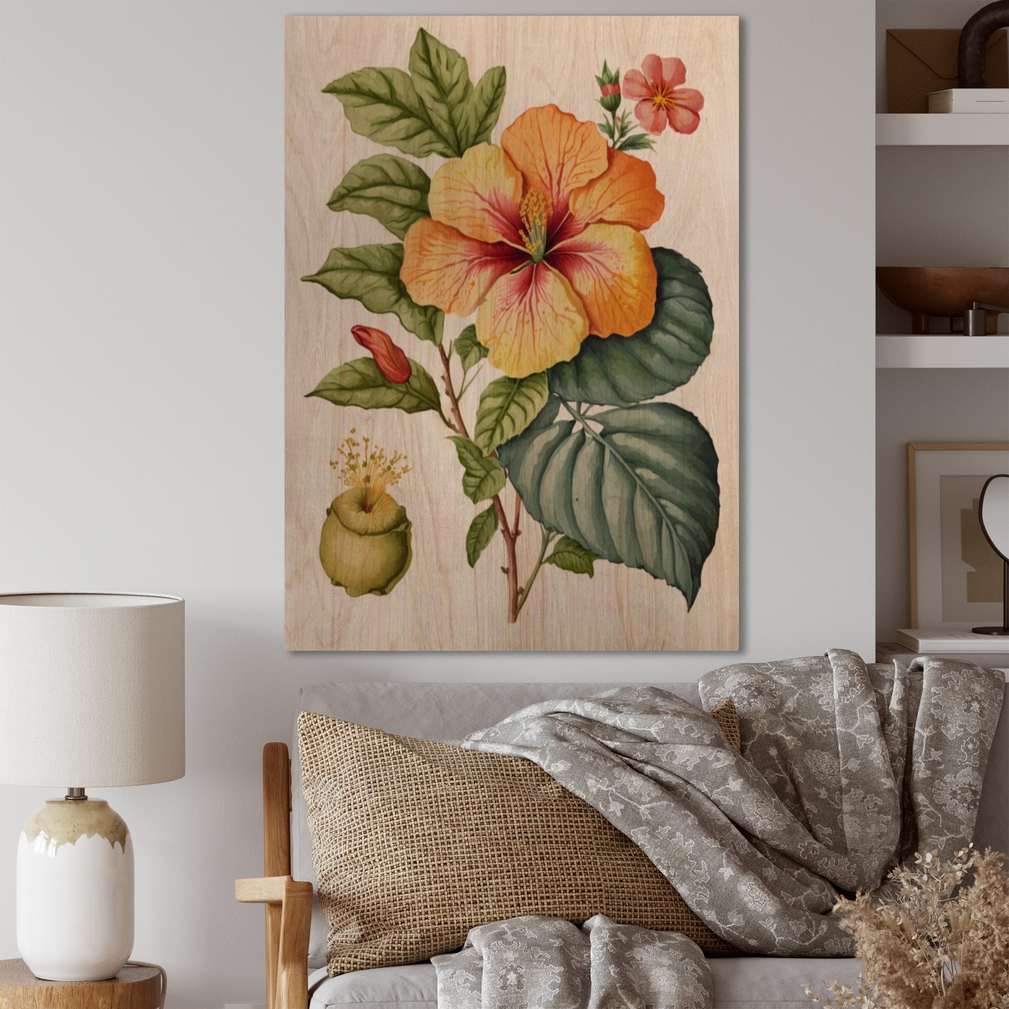 Designart 'Blossiming Yellow Retro Hibiscus II' Floral Hibiscus Wood Wall Art - Natural Pine Wood