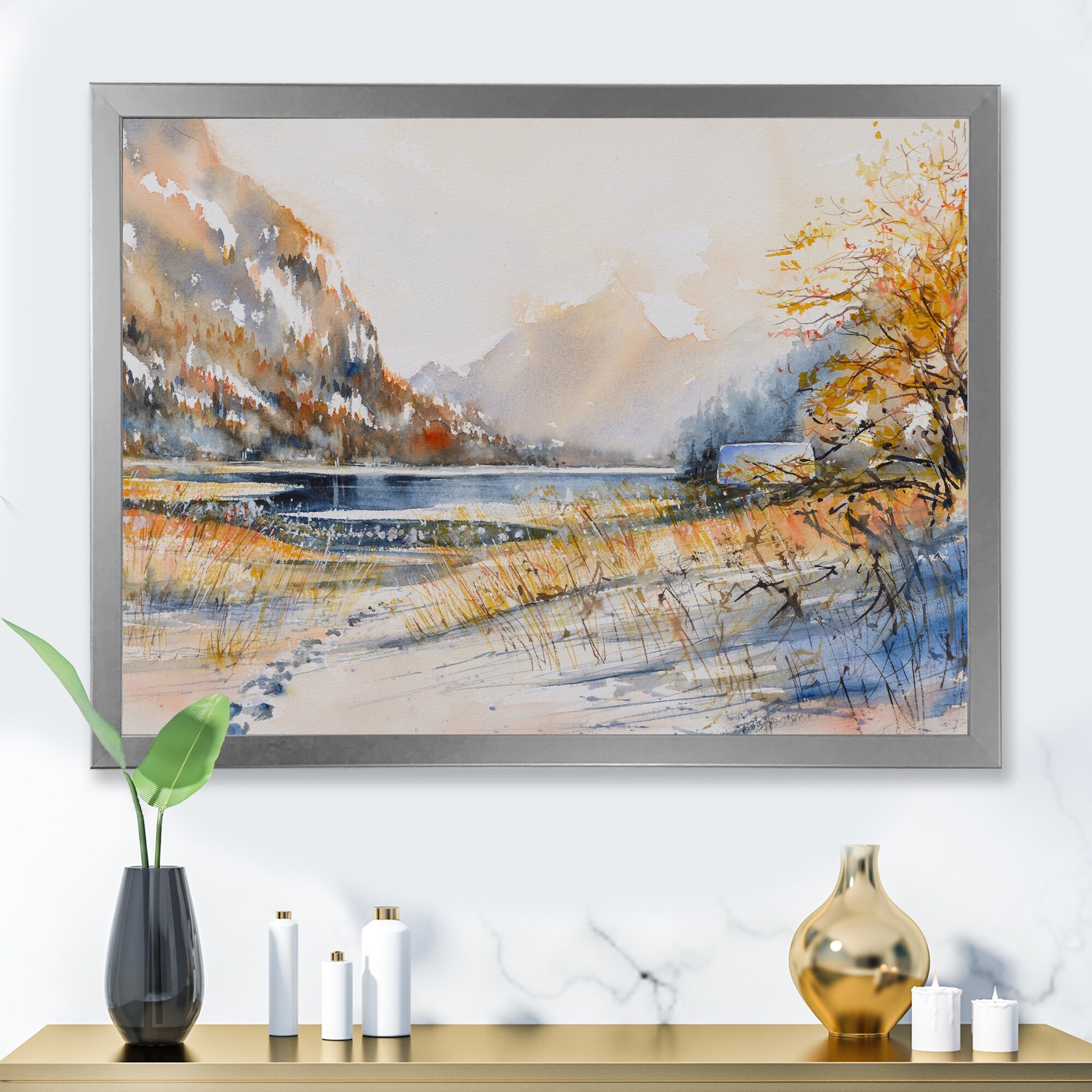 Designart "Winter Landscape With Mountain Lake" Traditional Framed Art Print
