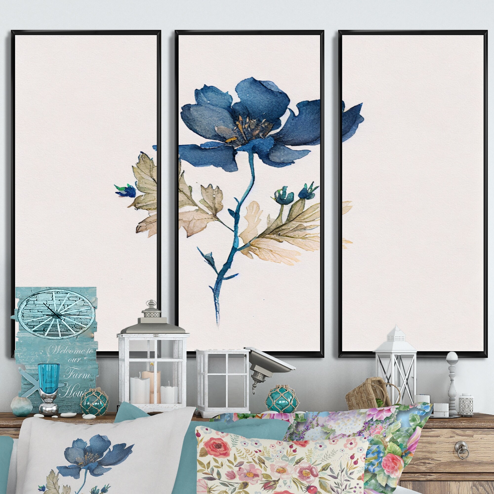 Designart "Dark Indigo Flower in Retro Colors V" Floral Framed Canvas Wall Art Print - 3 Panels