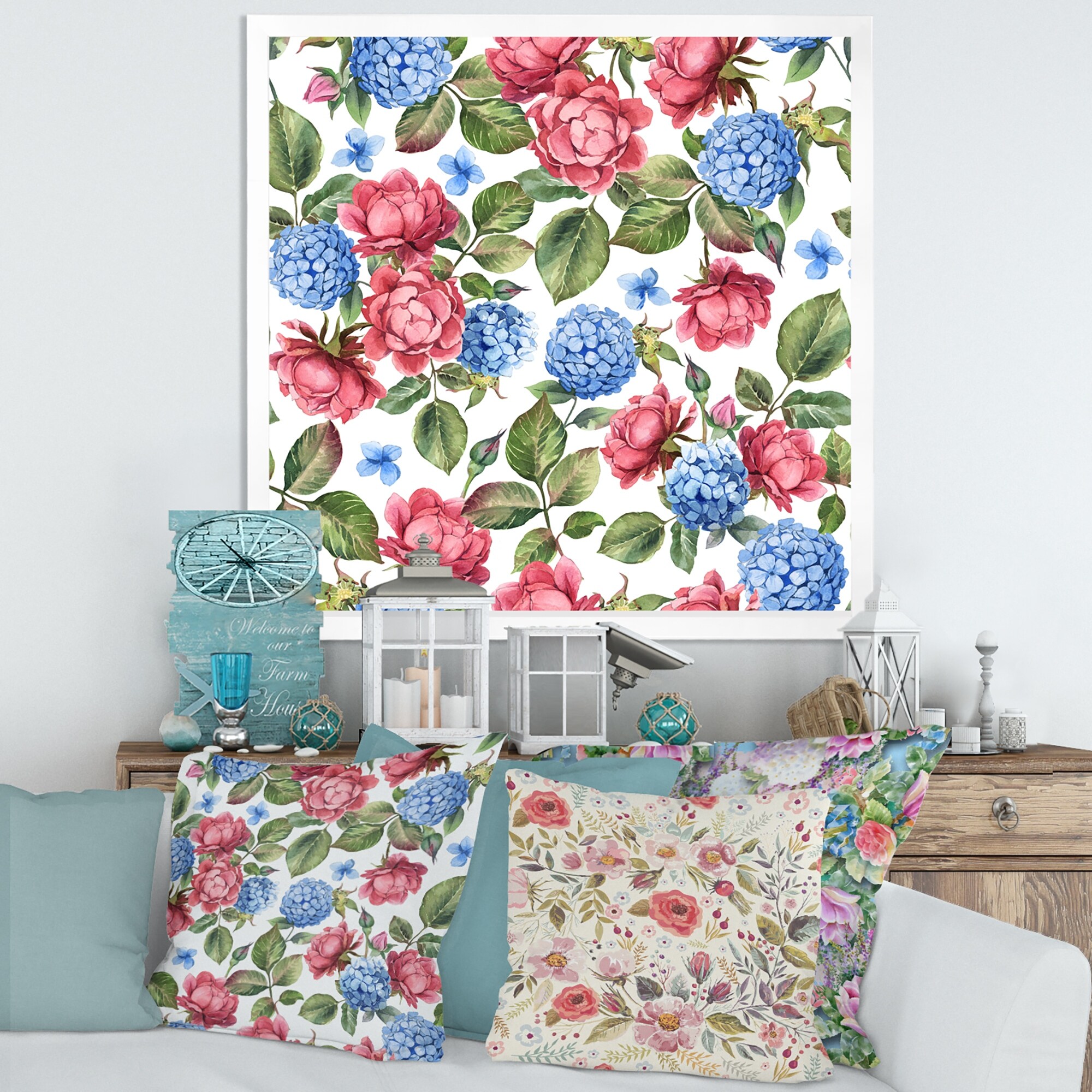 Designart "Pink Rose And Blue Hydrangea With Leaves on White" Patterned Framed Art Print