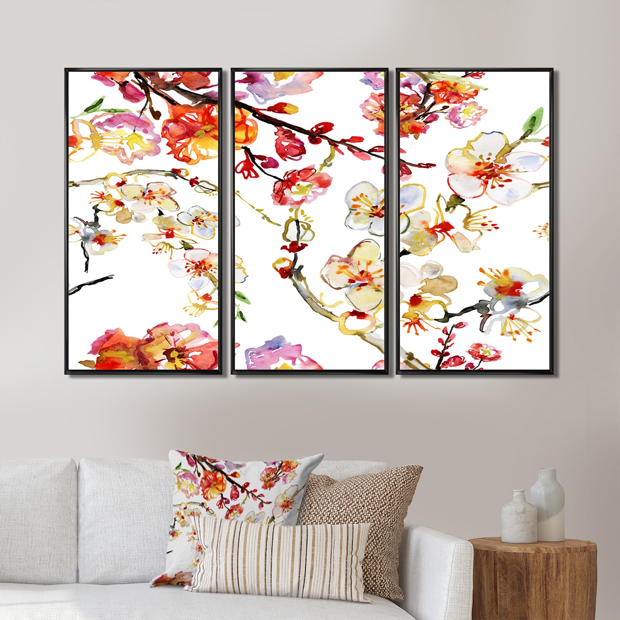 Designart "Sakura Flowers in Red And Yellow" Traditional Framed Art Prints Set of 3 - 4 Colors of Frames