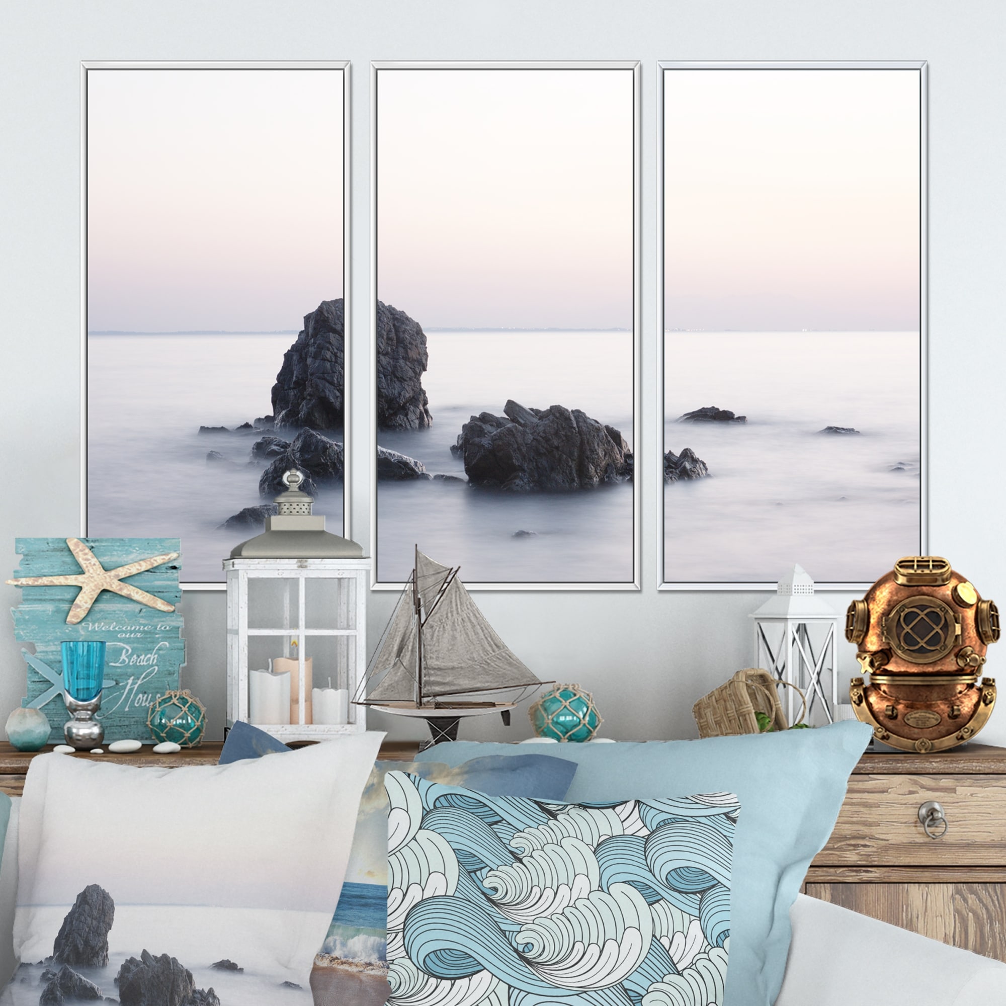 Designart "Rocks in the Sea Black and White" Sea & Shore Framed Art Prints Set of 3 - 4 Colors of Frames