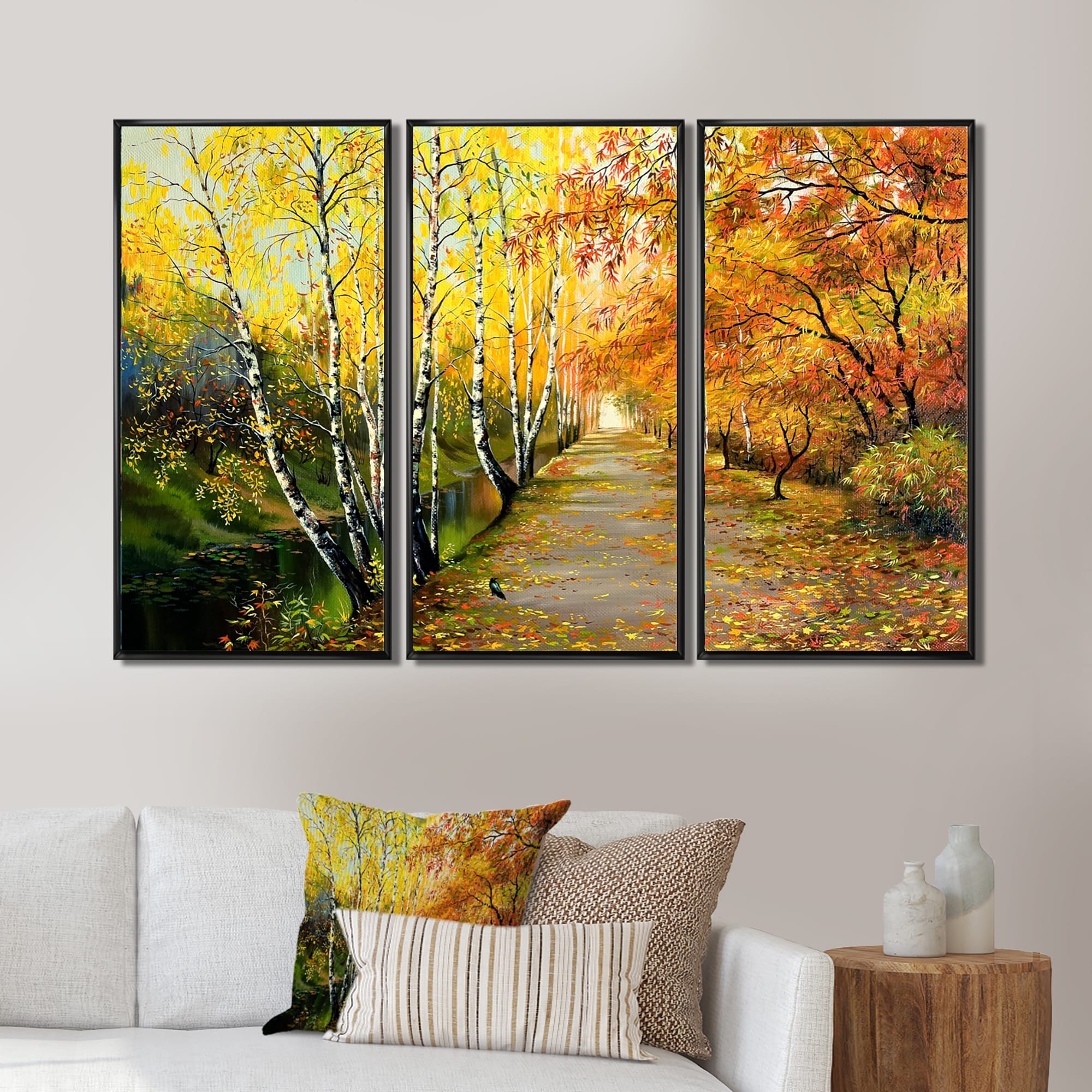 Designart "River In the Autumn Woods" Traditional Framed Wall Art Set of 3 - 4 Colors of Frames