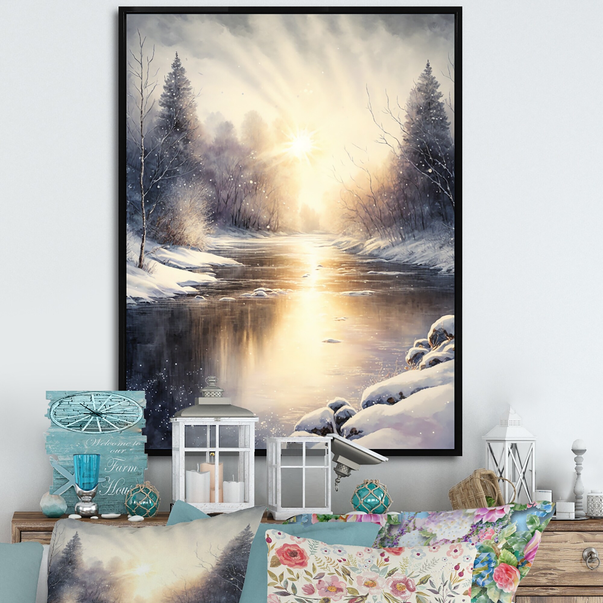 Designart "Sunlight Reflecting the Snow Forest River II" Landscape Lake Framed Canvas Wall Art Print