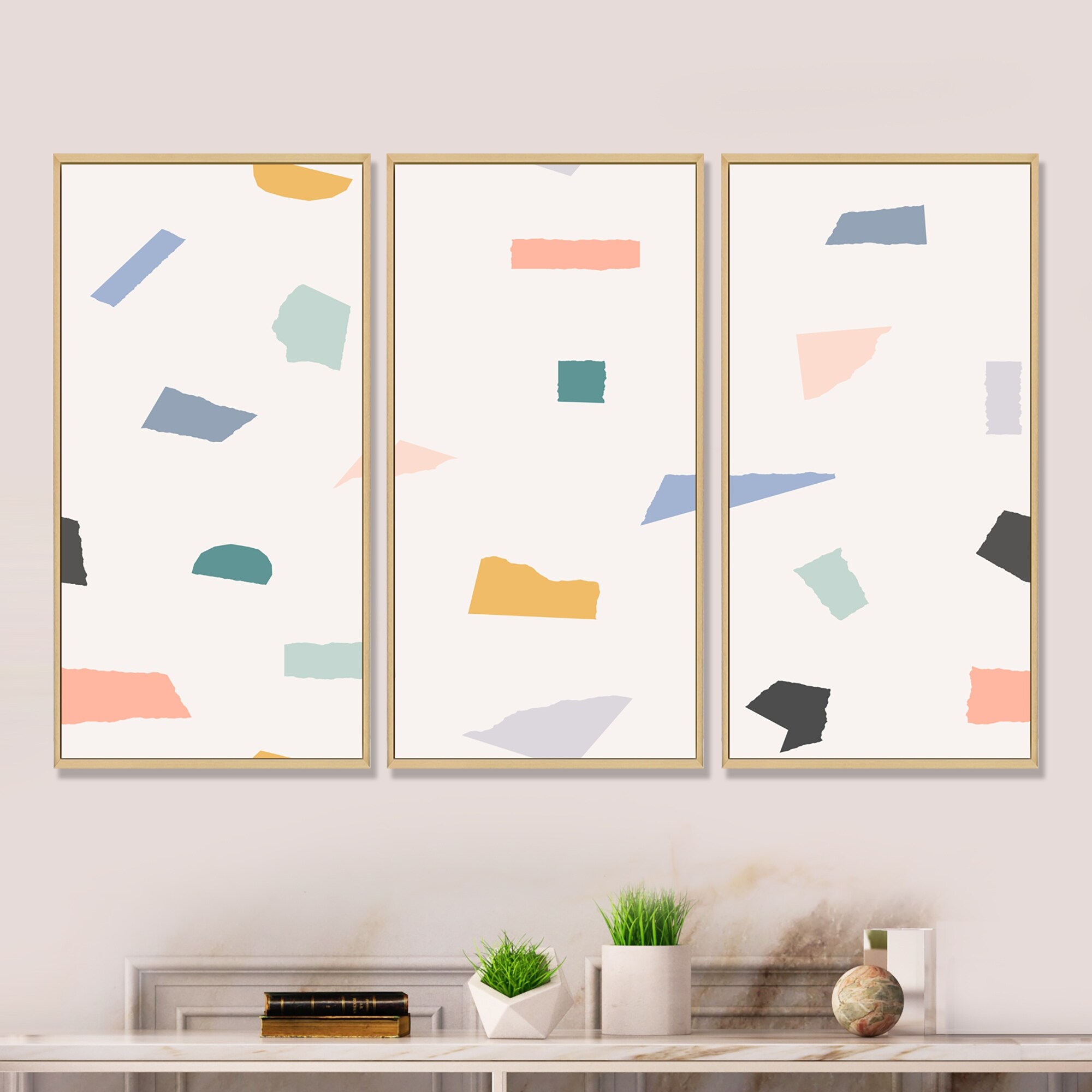 Designart "Pastel Retro Geometrics I" Modern Framed Canvas Wall Art Set of 3 - 4 Colors of Frames