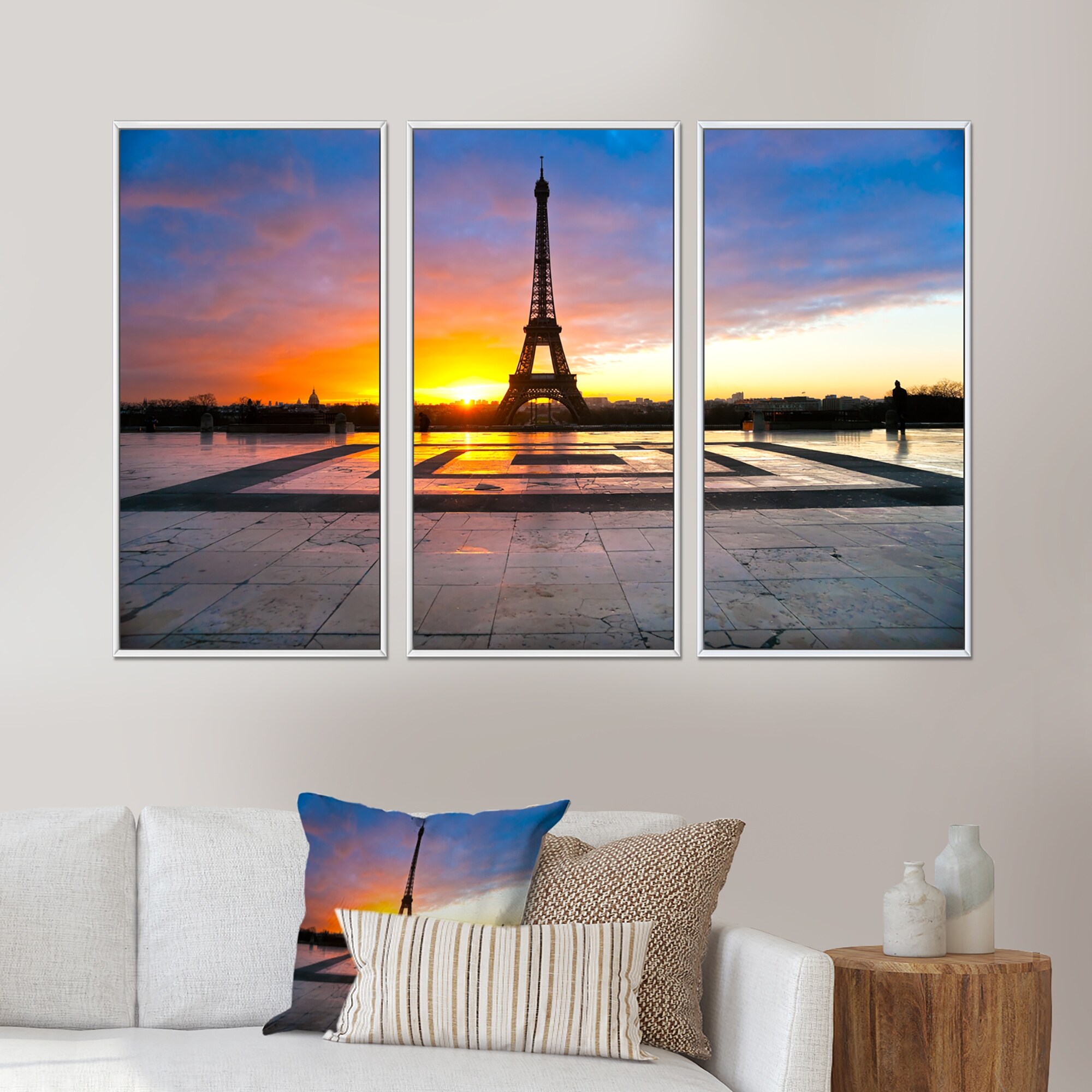 Designart "Paris Eiffel Towerat Beautiful Sunrise" Landscape Framed Canvas Wall Art Set of 3 - 4 Colors of Frames