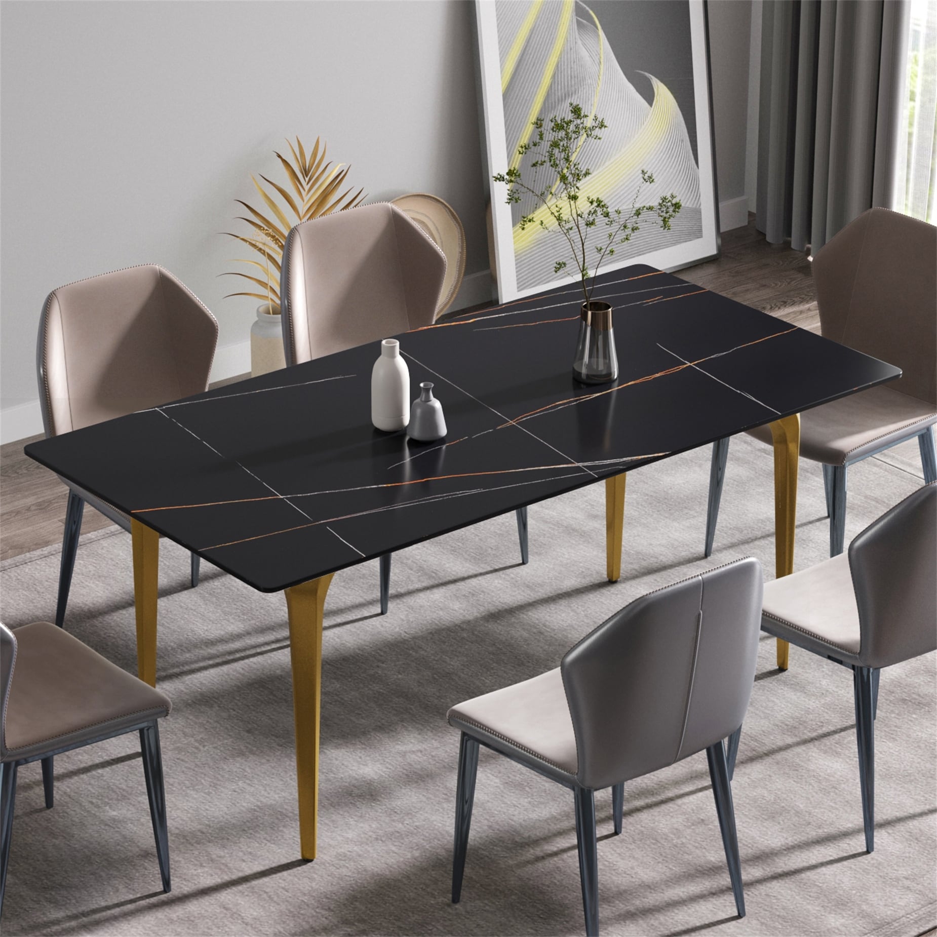 63 Inch Artificial Stone Metal Leg Rectangular Dining Table for 6