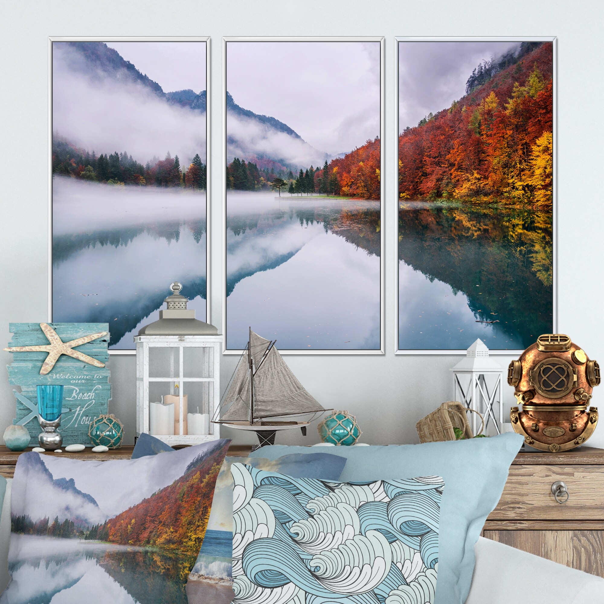 Designart "Reflections On Emerald Lake in Autumn" Nautical & Coastal Framed Art Set of 3 - 4 Colors of Frames