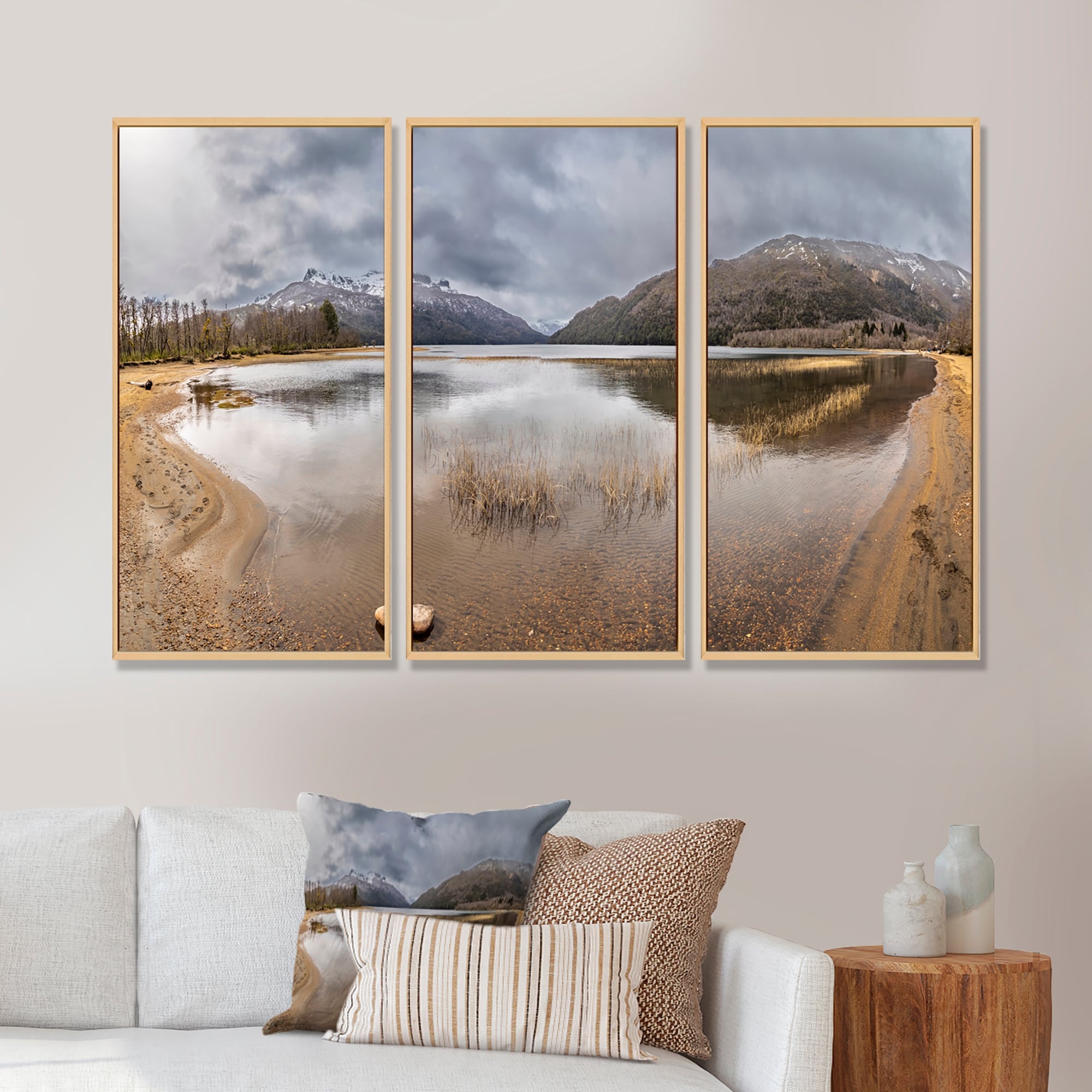 Designart "Lake Among Autumn Mountains of Patagonia" Traditional Framed Canvas Wall Art Set of 3 - 4 Colors of Frames
