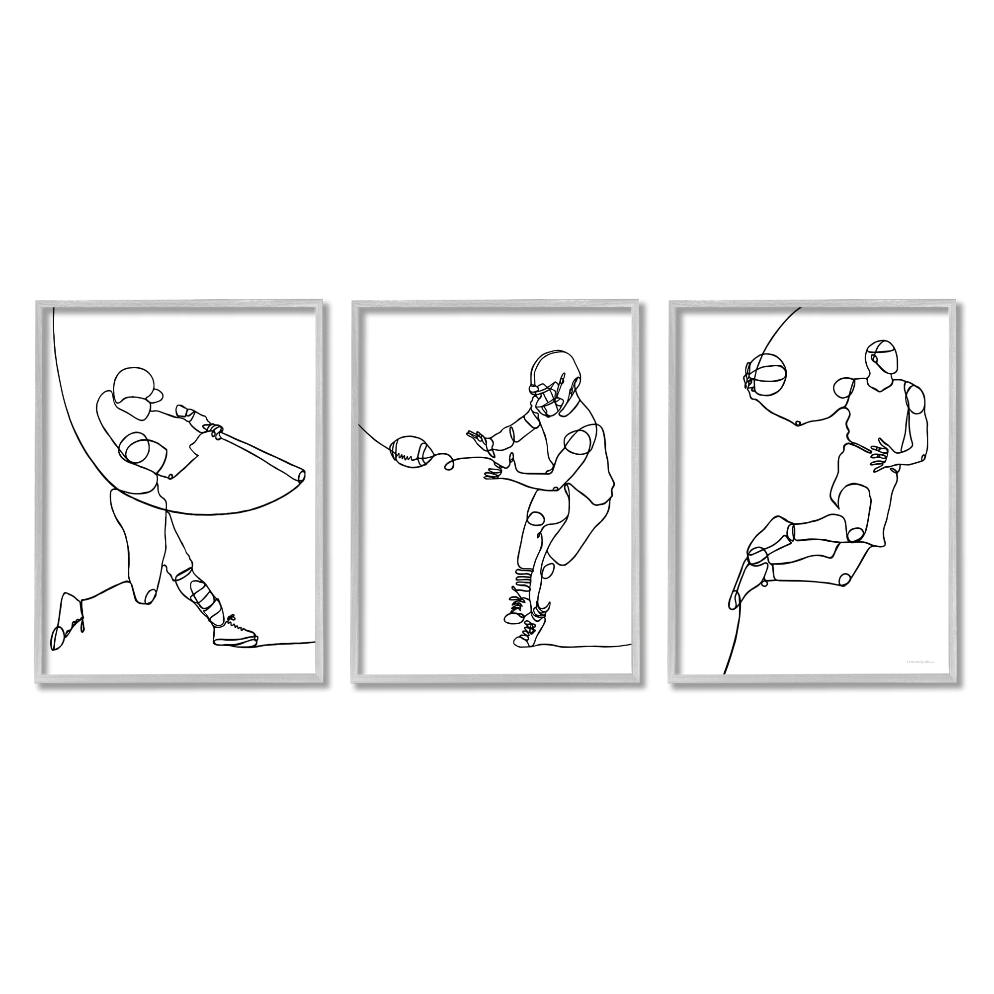 Stupell Industries Simple Line Doodle People Playing Sports Baseball Football Basketball Framed 3 Piece Wall Art - Black