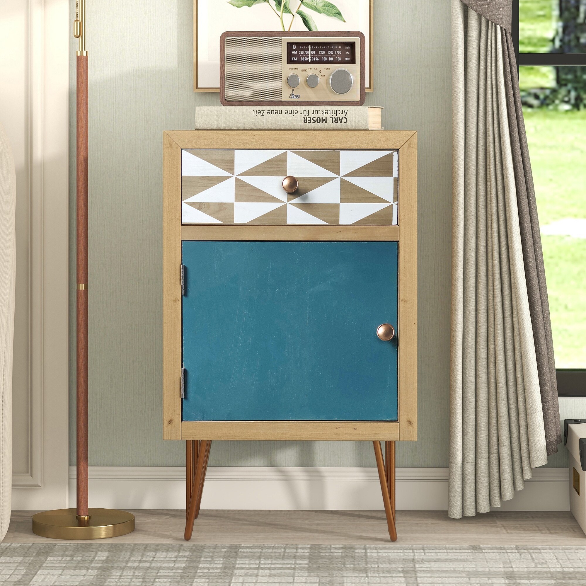 Set of 2 Mid Century Bedside Table,Drawer and Shelf , Natural