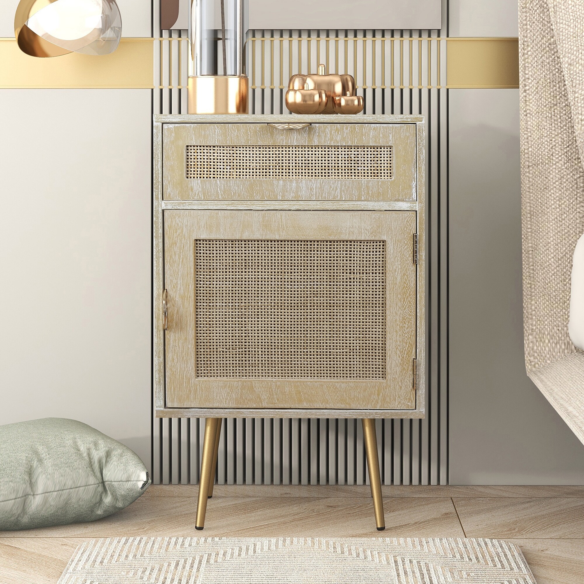 Wooden Nightstand with Rattan Panel,One Drawer ,One Cabinet and Metal Feet  Bedside Table (Natural)