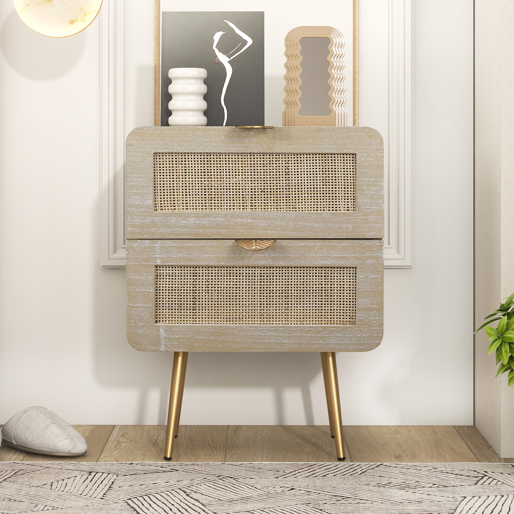 Wooden Nightstand with Rattan Panel,Two Drawer and Metal Feet  Bedside Table (Natural)