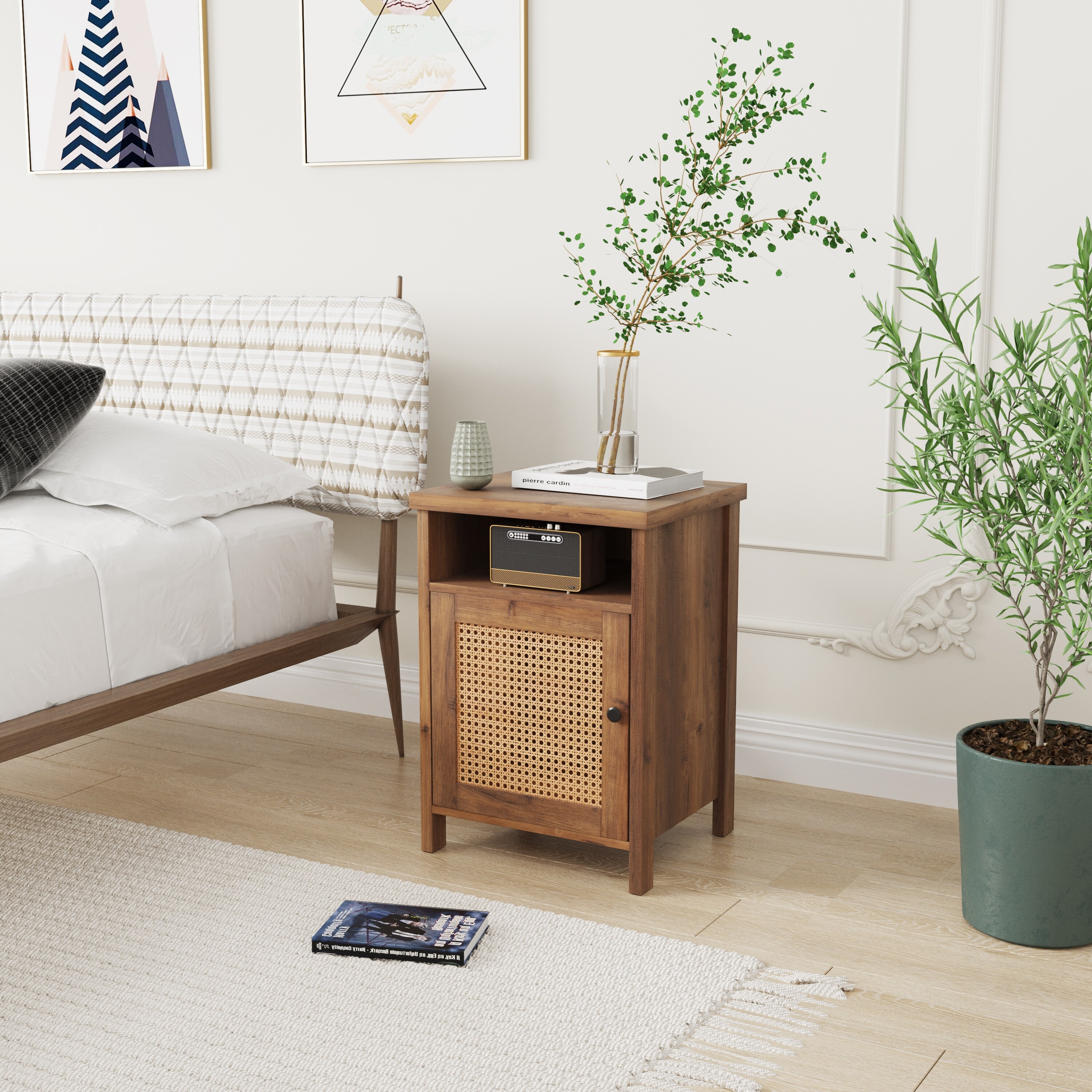 Rustic Rattan Door Nightstand, Bedside Table with Open Storage