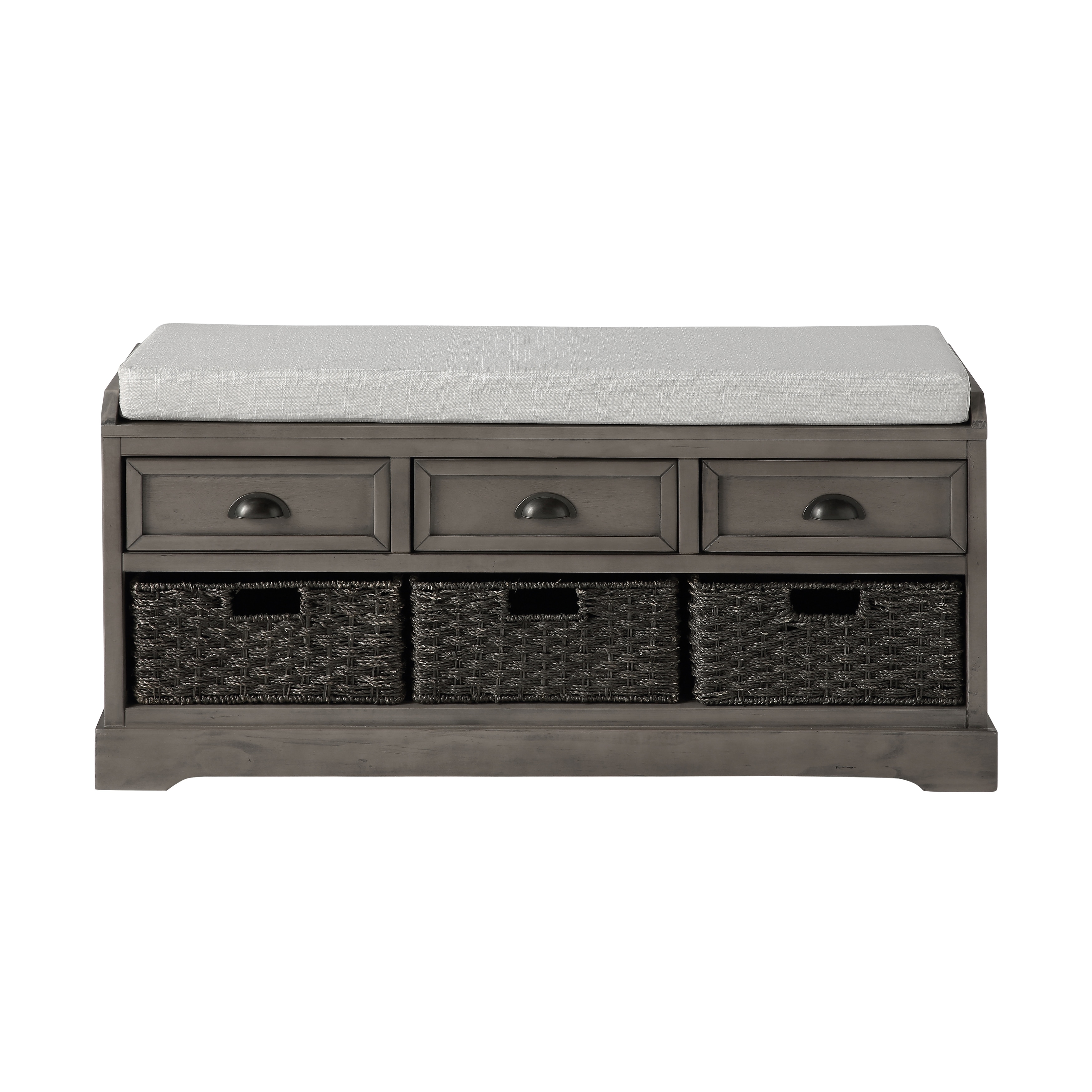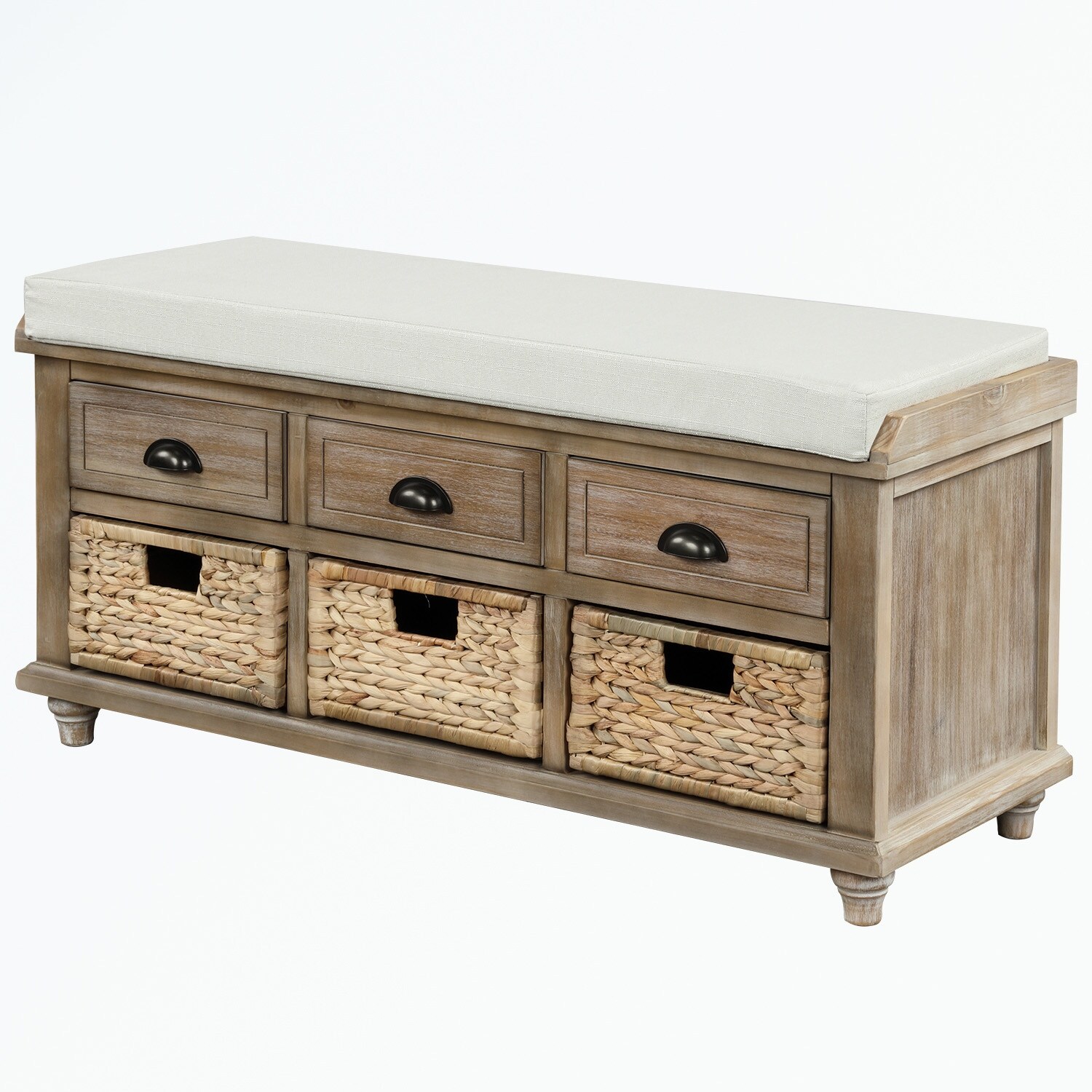 Wood Storage Bench with 3 Drawers and 3 Woven Baskets