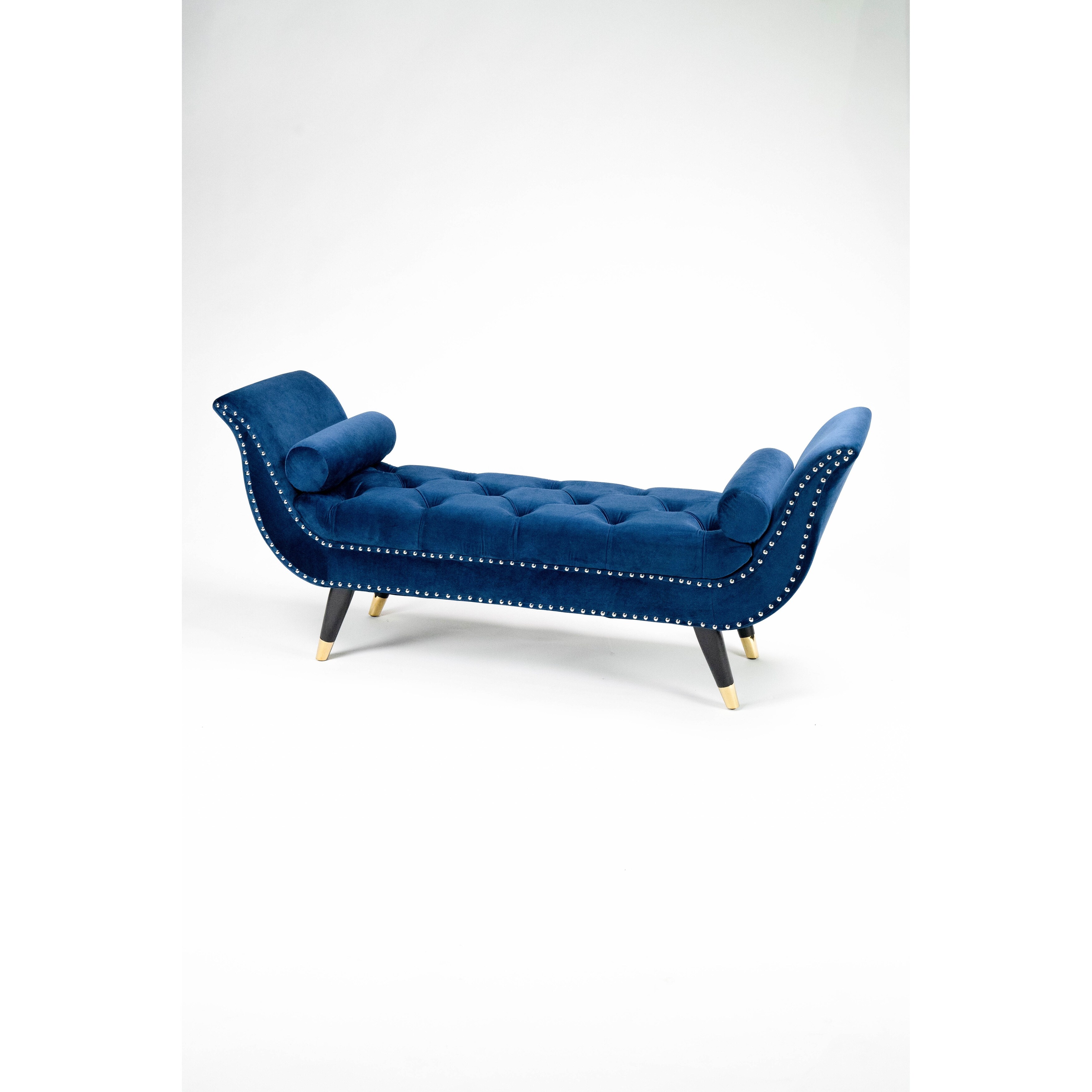 Navy Blue Button-Tufted Velvet Bench with Nailhead Trim, Metal Legs, and Two Pillows