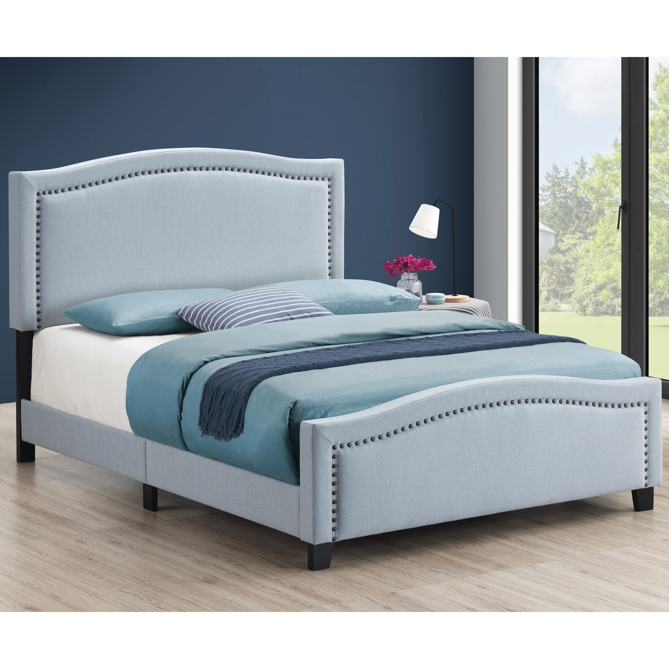 Modern Classic Design Light Blue Upholstered Bed with Brass Nailheads