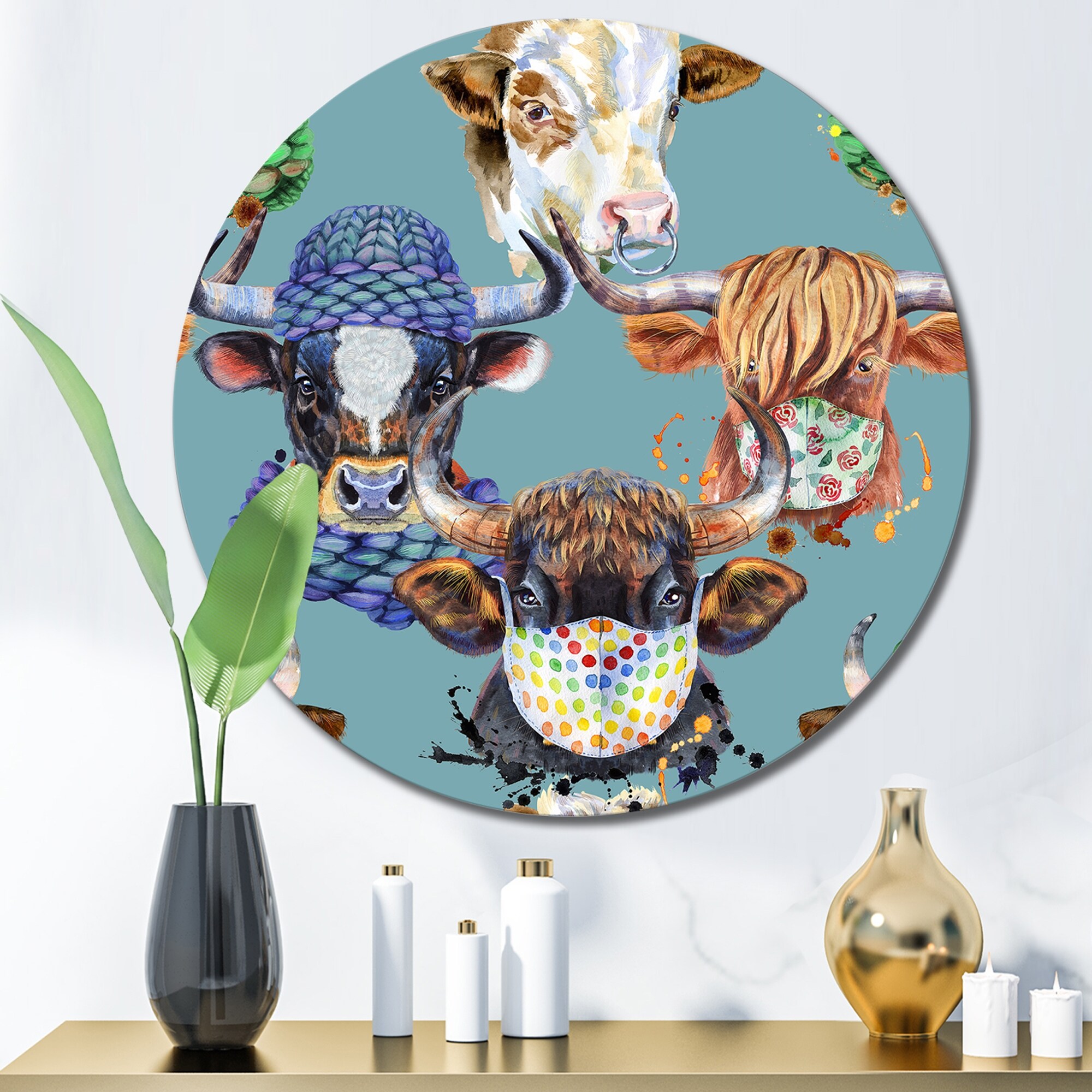 Designart 'Colorful Bulls on Blue' Patterned Metal Circle Wall Art