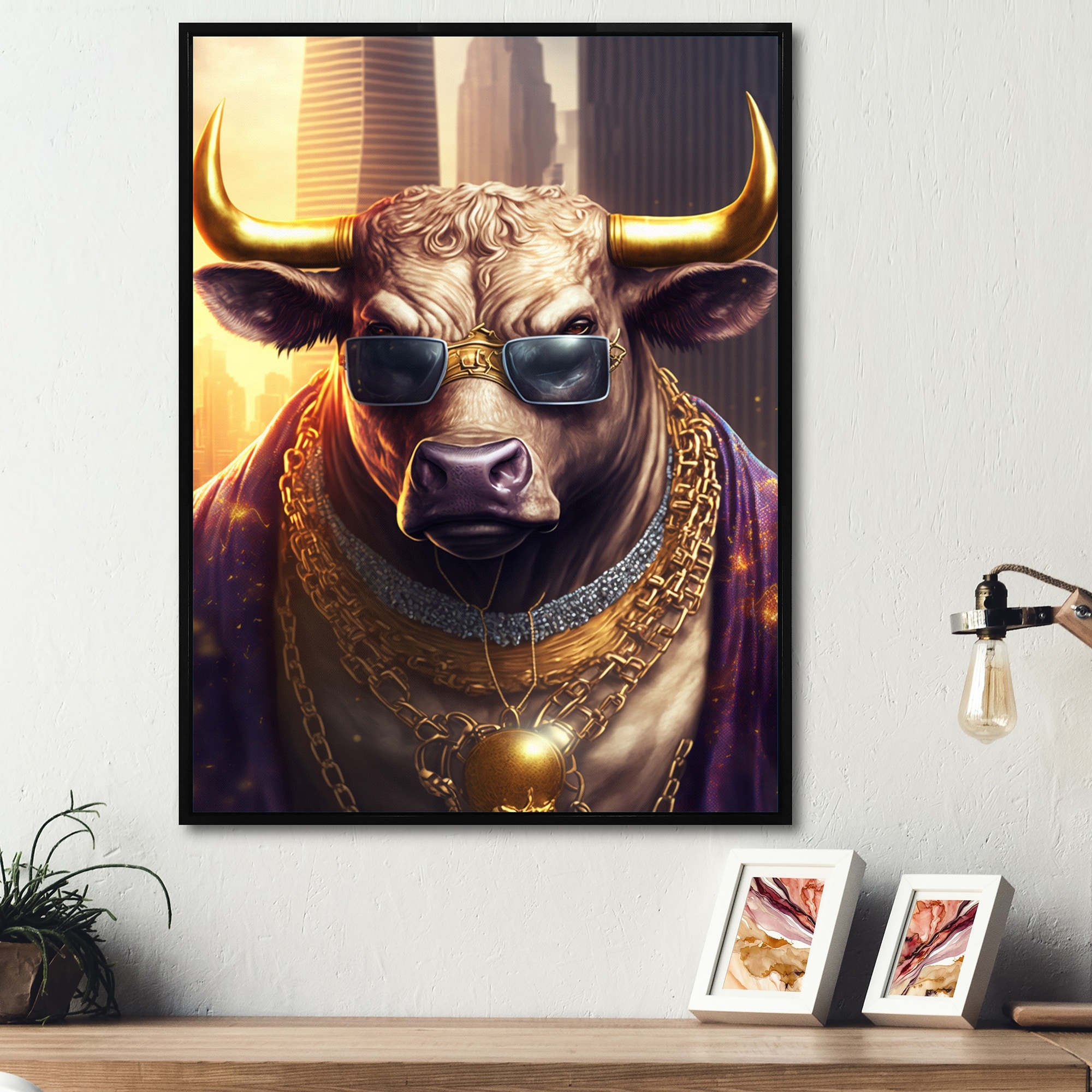 Designart "Bull Gangster in NYC II" Animals Framed Canvas Art Print