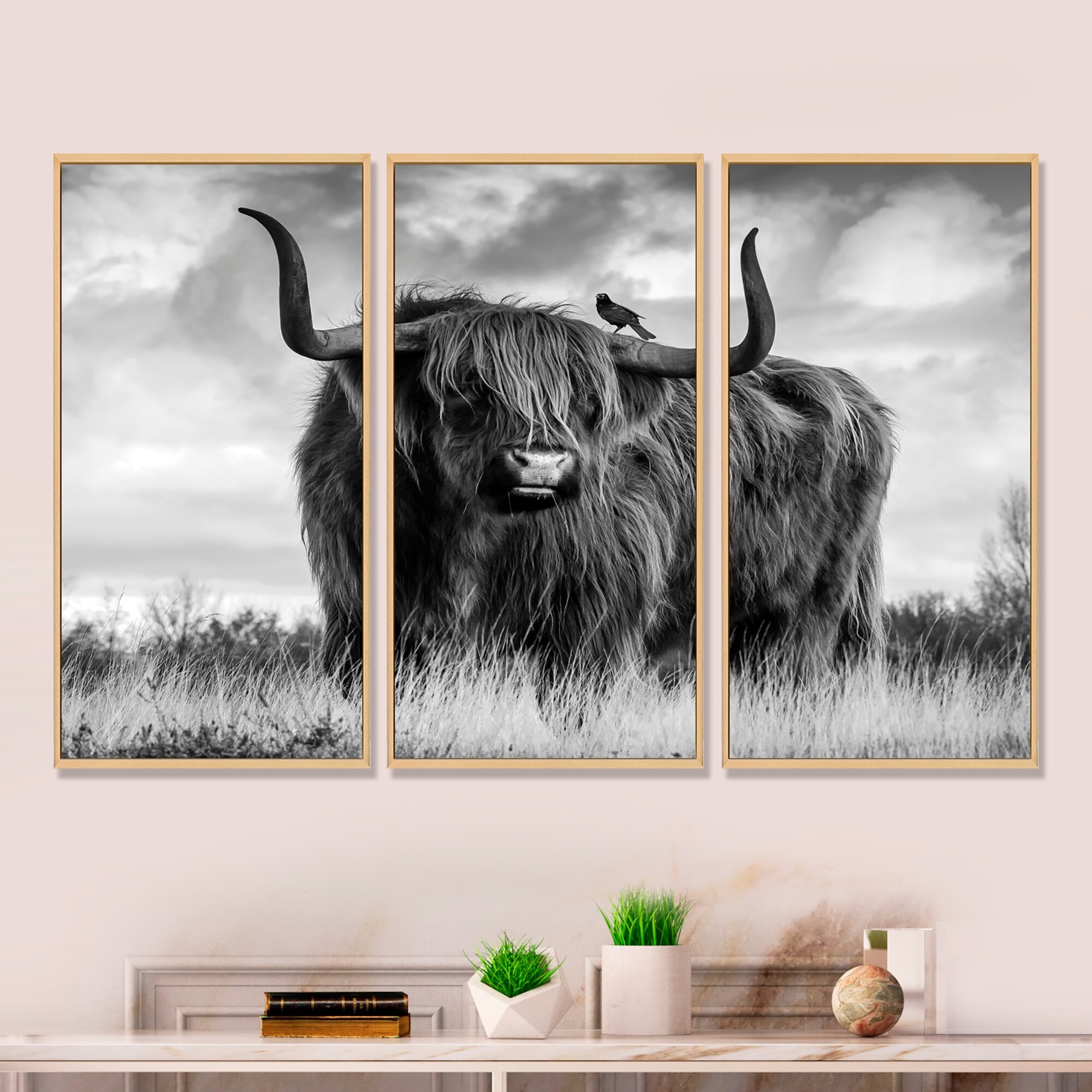 Designart "Longhaired Scottish Bull" Cottage-Animal Framed Artwork Set of 3 - 4 Colors of Frames